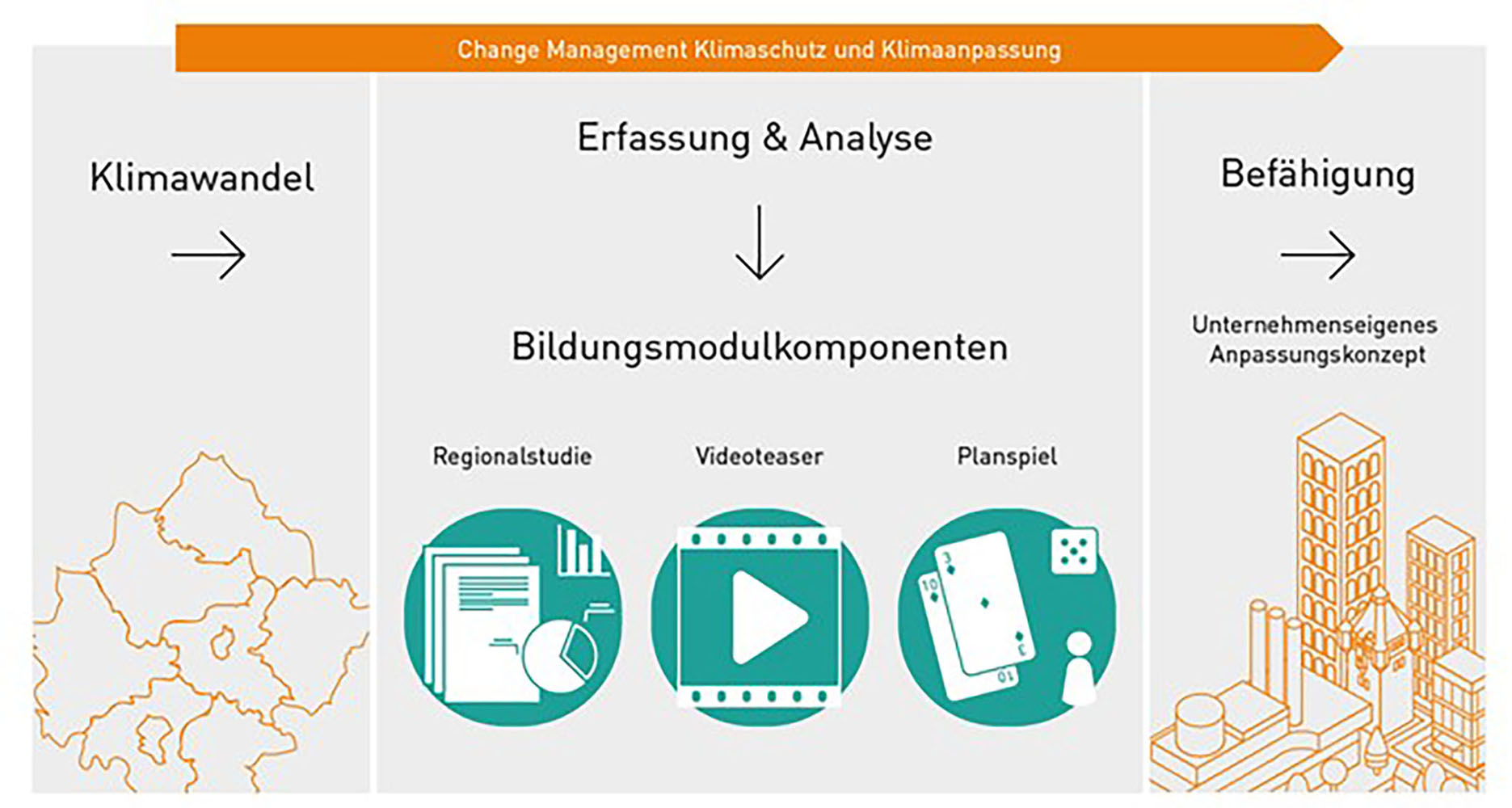 Mit den entwickelten Bildungsangeboten sollen Akteurinnen und Akteure von Handwerksunternehmen, kleinen und mittleren Unternehmen sowie Großkonzernen Grundbegriffe, Kontext und Wechselbeziehungen des Klimawandels, insbesondere hinsichtlich der Klimaanpassung verinnerlichen und mittels Game-based learning (GBL) in einer geschützten Umgebung relevante Entscheidungen treffen und deren Wirkungen erleben. Das Ziel ist die Verbesserung der aktuellen Wissensbasis, um Handlungsmöglichkeiten und Strategien zur Klimaanpassung zu vermitteln (Wissen). Diese Erkenntnisse sollen die Motivation steigern (Sensibilisierung), Erlerntes in die berufliche Praxis zu überführen und individuell umzusetzen (Befähigung).