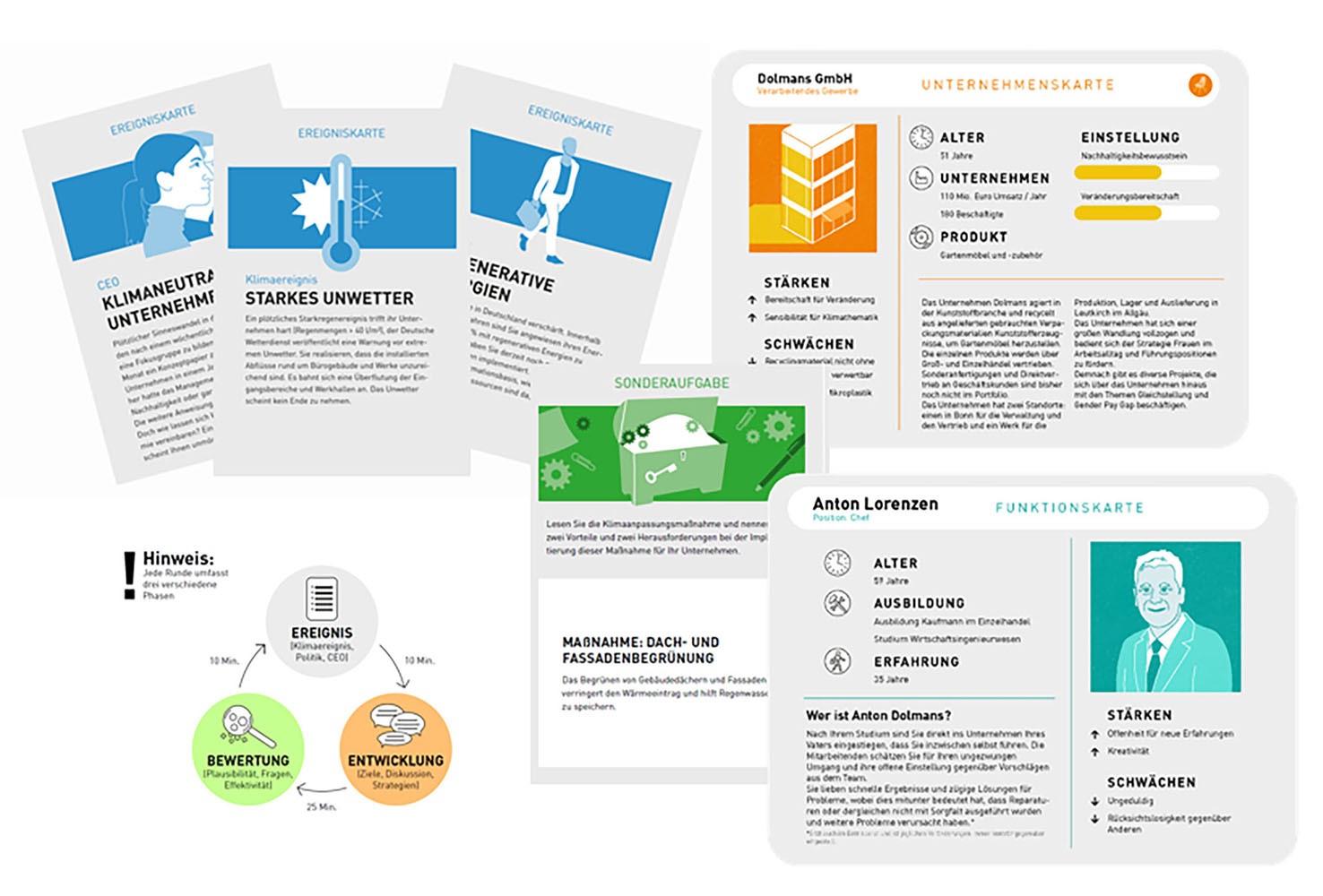 - Für eine qualitative Evaluation führen Personen aus Unternehmen und klimarelevanten Funktionen das Planspiel durch. Nach diesem sechstündigen, interaktiven Workshop, werden sie mit Experteninterviews zur Einschätzung des Planspiels befragt. Der Ansatz grenzt sich methodisch von klassischer, formaler Evaluationsforschung ab, thematisiert jedoch ähnliche Dimensionen von Wissenserwerb und Lernerfahrung, um vergleichbare Ergebnisse zu erhalten.