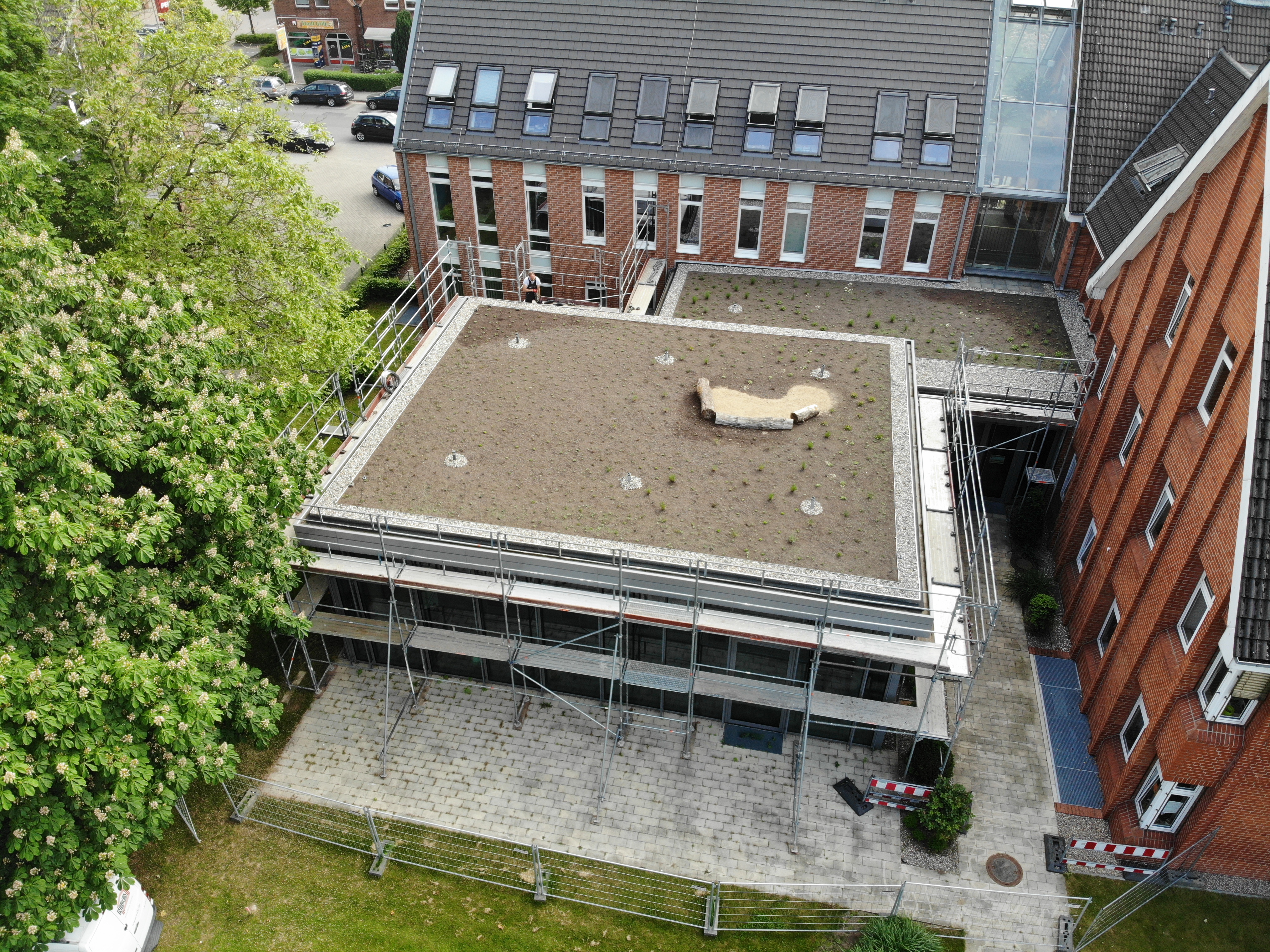 - Die Dachbegrünung nimmt CO2 auf und trägt so direkt zum Klimaschutz bei. Weiter wird durch die Pflanzen insgesamt ein luftreinigender Effekt erzielt (u.a. im Bereich Feinstaub). Zusätzlich wird das Themenfeld Insektensterben adressiert. Alle Flächen wurden entsprechend angelegt. Dabei wurden ein Hauptaugenmerk auf den Blühzeitraum gelegt und die Flächen um Sandflächen mit Totholz ergänzt, als „Wohnortangebot“ für Insekten. Kommunikativ werden diese unterschiedlichen Themenfelder auch verknüpft.