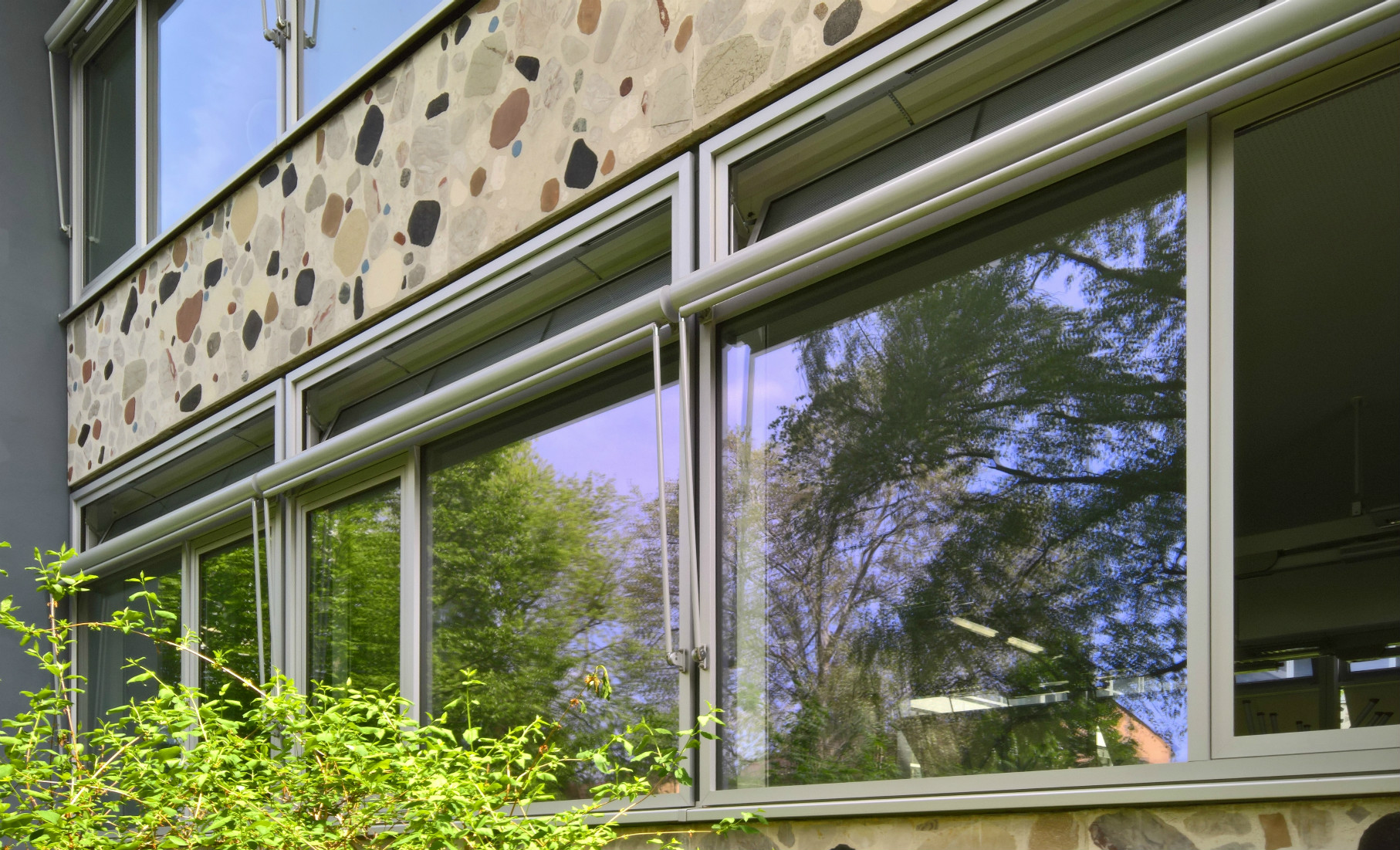 Die unteren Öffnungsflügel des Fensters können manuell geöffnet werden und dienen gleichzeitig als Fluchtweg. Die motorisch geregelte Fensterlüftung wird auch zur Nachtlüftung genutzt. Hierzu werden in Nachzeiten bei kühleren Temperaturen die Oberlichter geöffnet, bis die Solltemperatur für den Komfort wieder erreicht werden. In austauscharmen Witterungslagen wird die Nachtlüftung bei Bedarf durch Abluftventilatoren unterstützt. Durch das Regelungskonzept der Nachtlüftung wird nur mit geringer elektrischer Hilfsenergie wirksam dem Aufheizen der Schulräumen entgegengewirkt.