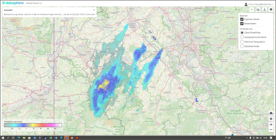 Mit diesem System werden der Städteregion Aachen und deren Versorgungs- und Dienstleistungsunternehmen eine räumlich und zeitlich hoch aufgelöste Darstellung von in Echtzeit gemessenen und durch entsprechende Berechnungs-Bibliotheken aufbereiteten Niederschlagsinformationen bereitgestellt. Durch die doppelte Polarisation ist es auch möglich, neben der Niederschlagsmenge auch die Niederschlagsarten (Regen, Hagel, Schnee, etc.) qualifiziert zu unterscheiden.