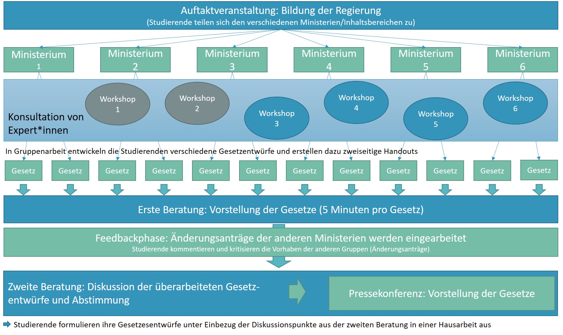 Die Entwicklung der konkreten Gesetzesentwürfe des Regierungsprogramms erfolgt in interdisziplinären Kleingruppen, die verschiedene Ressorts einer Landesregierung darstellen. Thematische Anregungen und Hintergrundwissen zu Möglichkeiten der Klimawandelanpassung erhalten die Studierenden in Workshops mit Wissenschaftler*innen und Fachexpert*innen sowie regionalen Nachhaltigkeitsinitiativen und Reallabors zu Beginn der Lehrveranstaltung. Höhepunkt des Moduls ist die Vorstellung, Diskussion und Abstimmung der verschiedenen Gesetzesentwürfe des landespolitisch orientierten Regierungsprogramms in parlamentarischen Debatten. Dabei nehmen die Studierenden nun die Rolle von Parlamentarier*innen ein.