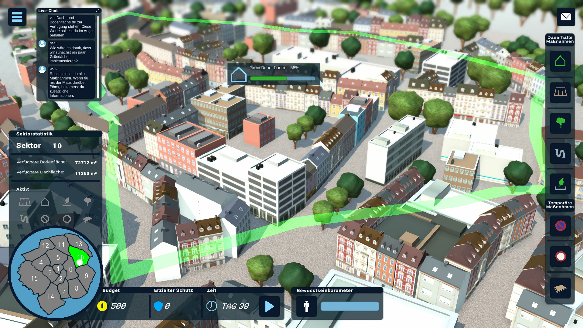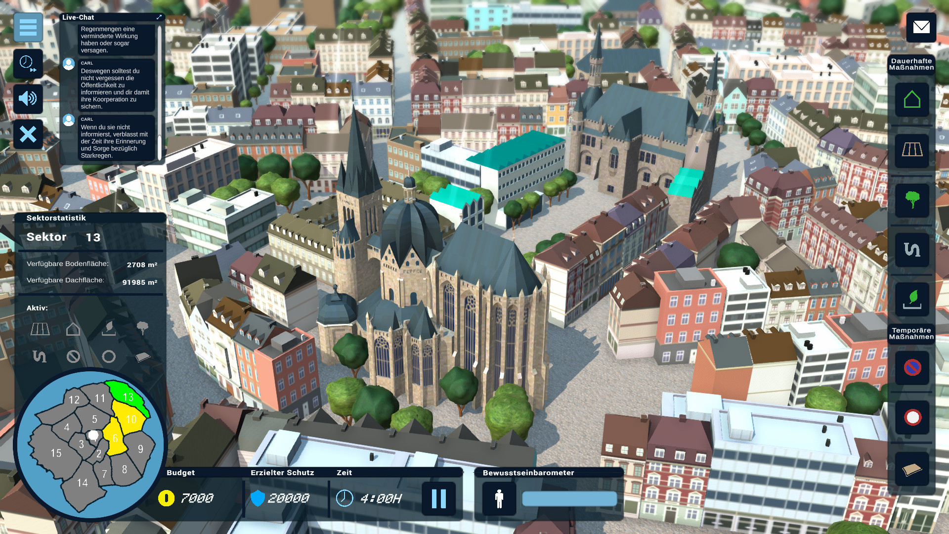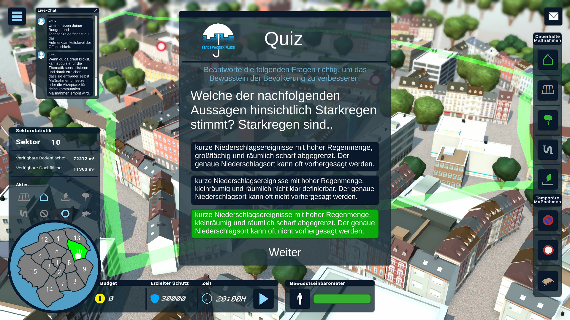 Ein zentraler Bestandteil des Spiels ist das Bewusstsein der Bevölkerung, das widerspiegelt, wie gut die Bewohner*innen Aachens mit dem Thema Starkregen vertraut sind. Je höher dieses ausfällt, desto effektiver werden Maßnahmen umgesetzt. Der Spieler bzw. die Spielerin kann hierbei immer wieder das Bewusstsein kurzfristig stärken, muss aber davon ausgehen, dass sich dies bei ausbleibendem Starkregen auch negativ auswirken kann. Zusätzlich ist eine Wissensabfrage implementiert: Beantwortet der Spieler bzw. die Spielerin Fragen richtig, steigt dadurch das Bewusstsein der Bevölkerung.