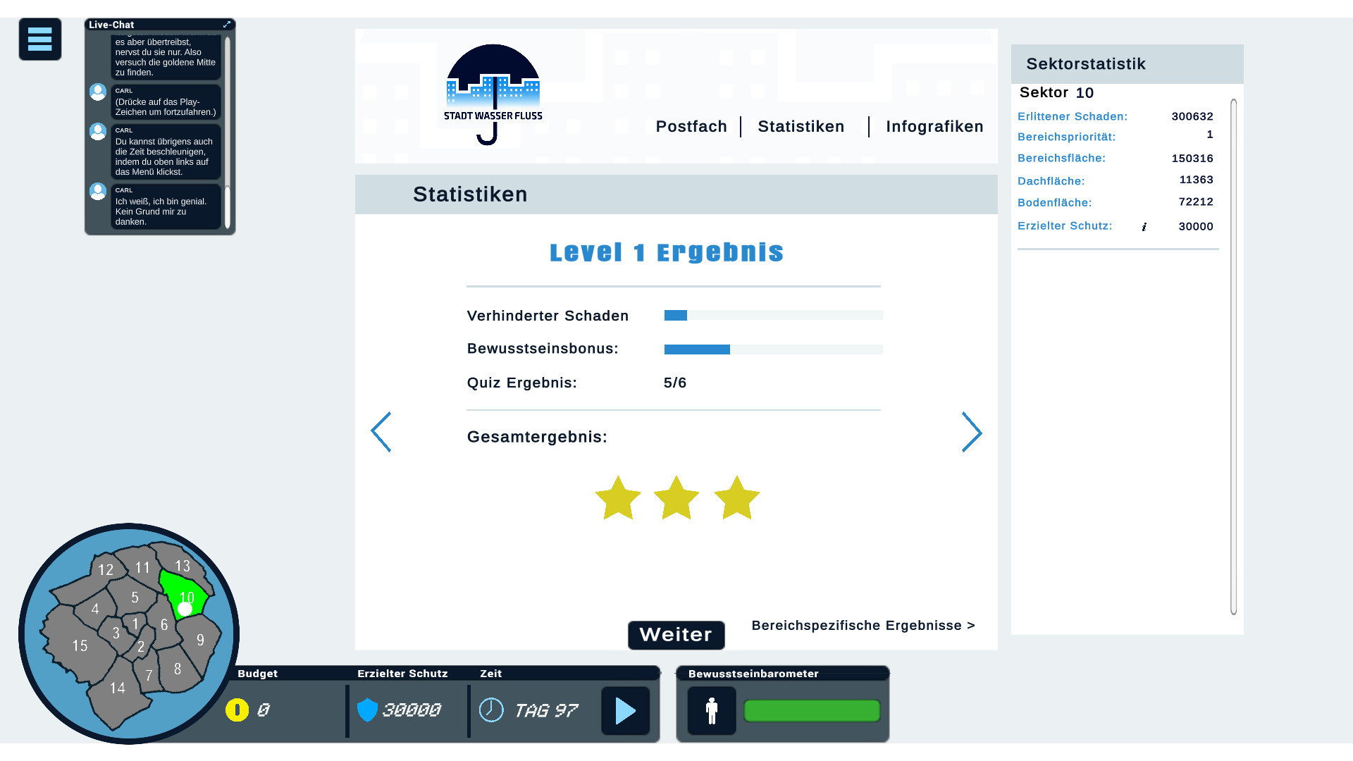 Am Ende jedes Levels erhält der Spieler bzw. die Spielerin Feedback zur Umsetzung. Konnte der Spieler bzw. die Spielerin die Stadt Aachen vor Starkregen schützen, erhält er/sie eine gute Bewertung. Hat er/sie etwa zu spät gehandelt oder das vorhandene Budget schlecht genutzt, fällt die Bewertung entsprechend aus...