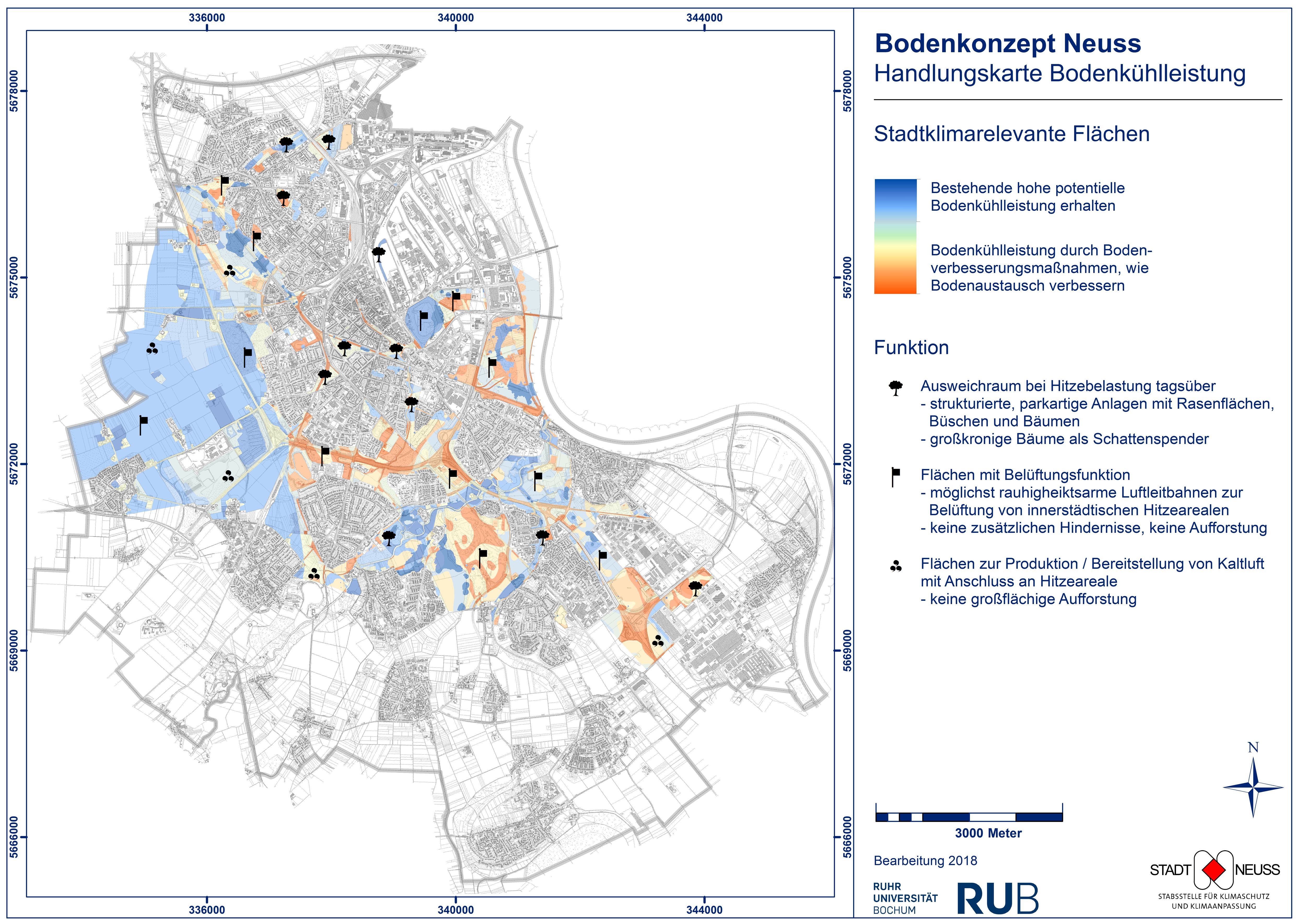 Im Ergebnis konnten beispielhaft für die Stadt Neuss eine Karte der Bodenkühlpotenziale berechnet und Empfehlungen für die Nutzung und Verbesserung der Kühlleistung in der Stadtplanung entwickelt werden. Durch die Integration von mikroskaligen Modellrechnungen in die Beurteilung des Bodenkühlpotenzials sind die Ergebnisse übertragbar auf andere Kommunen, ohne dass aufwändige Messungen notwendig werden.