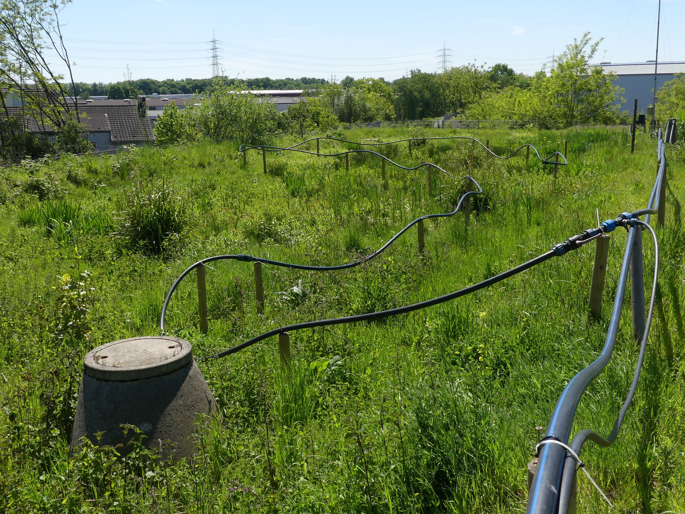- Unter Anleitung der Ruhr-Universität Bochum hat die Stadt zusammen mit einem lokalen Ingenieurbüro ein Messsystem aufgebaut, welches über der Förderzeitraum der wissenschaftlichen Untersuchung hinaus bestehen bleibt. Auf die Weise können auch langfristig Daten gesammelt und ausgewertet werden. Das entwickelte Messsystem umfasst Messungen zu Wasserständen, Wasserzufuhr und Wasserverlust, Bodenfeuchte, Lufttemperatur, Luftfeuchtigkeit und Luftdruck, Windgeschwindigkeit und Windrichtung sowie Niederschlagsmengen. Die erhobenen Daten ermöglichen eine Evaluation des Vorhabens hinsichtlich seiner Funktionalität sowie möglichem Optimierungsbedarf.