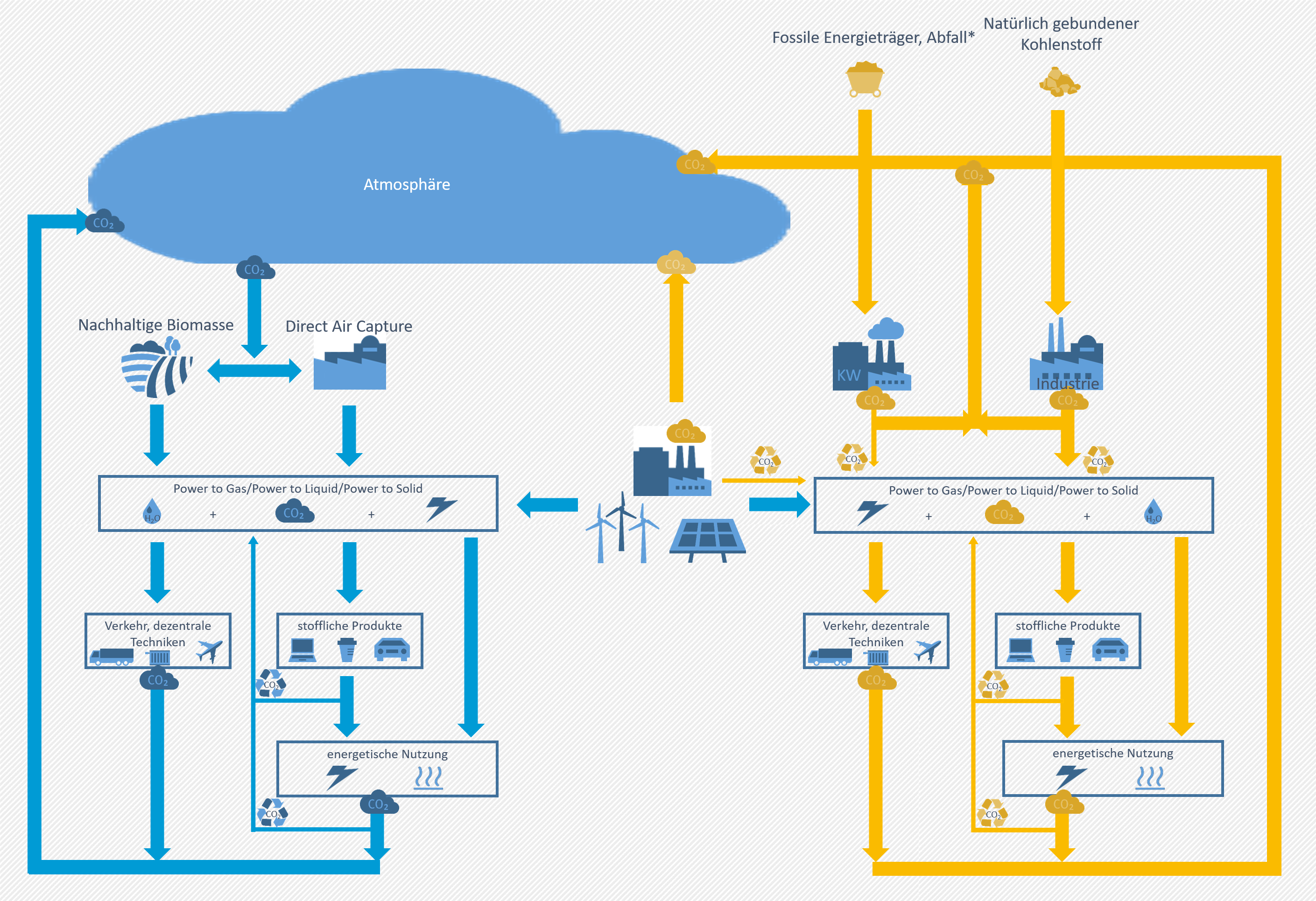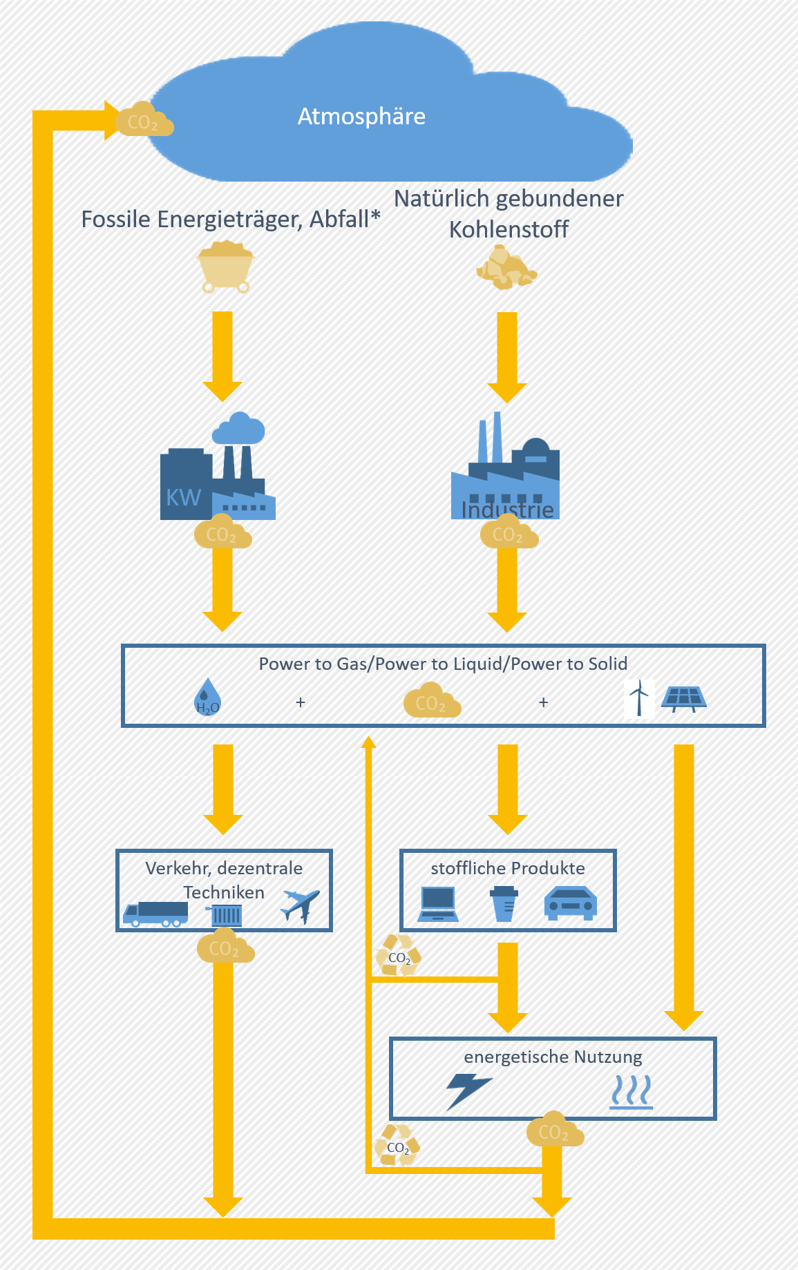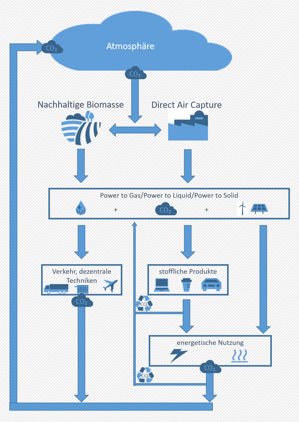 Wird Kohlenstoff aus der Atmosphäre entnommen und anschließend wieder emittiert, führt dies unabhängig von der Mehrfachnutzung zu einem geschlossenen Kreislauf, bei dem keine Mehremissionen durch den Menschen verursacht werden. Voraussetzung ist allerdings, dass entlang der gesamten Prozesskette der CCU-Maßnahmen keine weiteren Treibhausgasemissionen entstehen und ausschließlich erneuerbare Energien für die energetischen Aufwendungen verwendet werden. Brenn-, Kraft- und Chemierohstoffe mit CCU aus atmosphärischem Kohlenstoff führen im Gegensatz zu CCU mit fossilem Kohlenstoff dann zu keinem treibhausgasrelevanten Ausstoß in den Anwendungsbereichen Verkehr, Wärme und Industrie. Veranschaulicht ist dies im Bild.