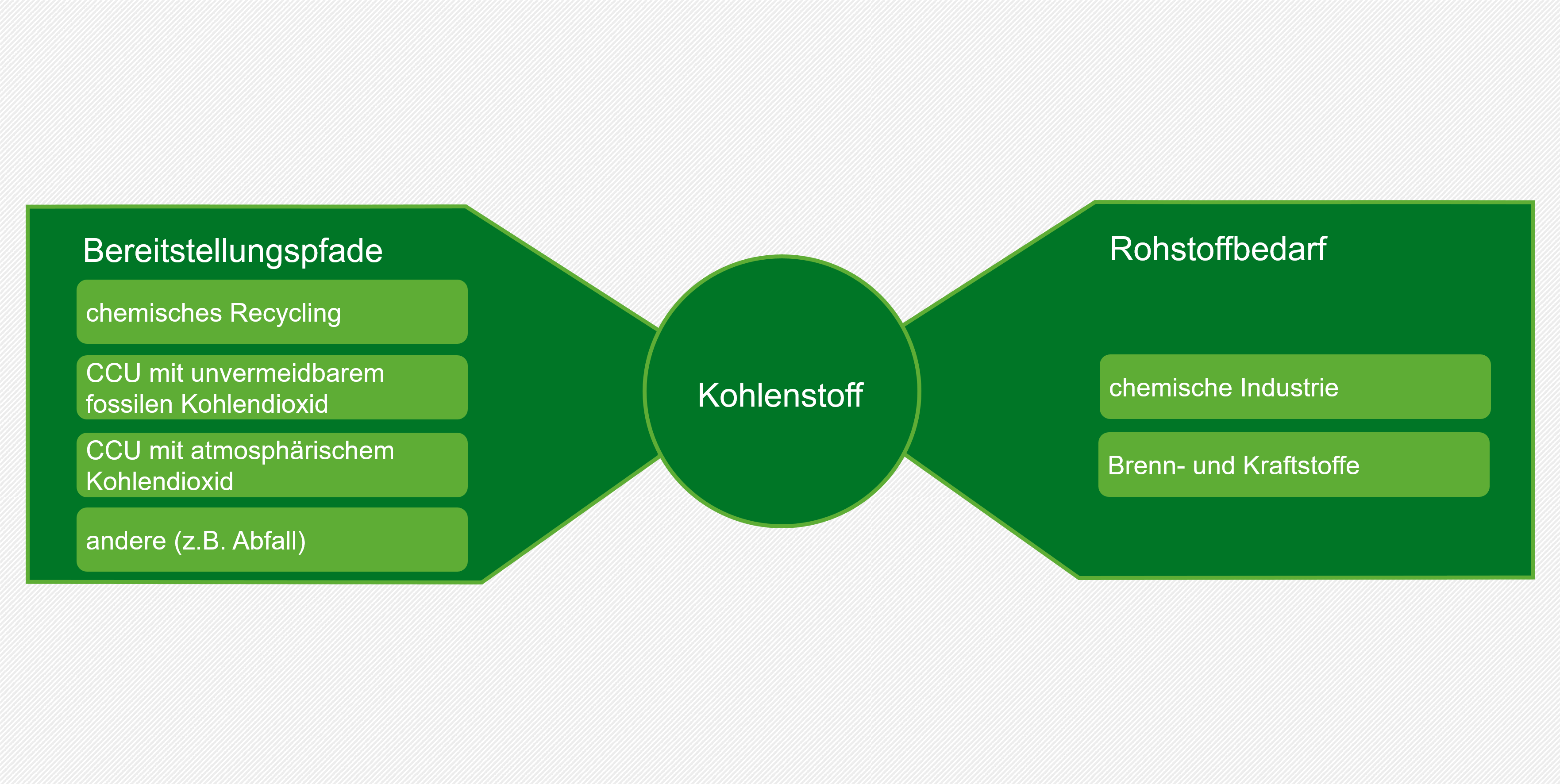 Die Abbildung zeigt schematisch den Bedarf an Kohlenstoff, der für die chemische Industrie und für die Herstellung von Brenn- und Kraftstoffen benötigt wird. Dem gegenüber steht eine Bereitstellung über chemisches Recycling, andere Kohlenstoffquellen wie nachhaltige (Rest-)Biomasse und das CO2 der Atmosphäre über CCU. Übersicht Kohlenstoffbedarf und Bereitstellungspfade