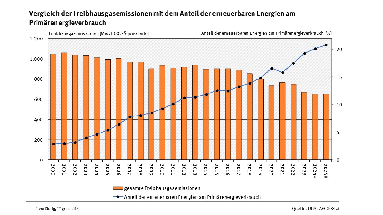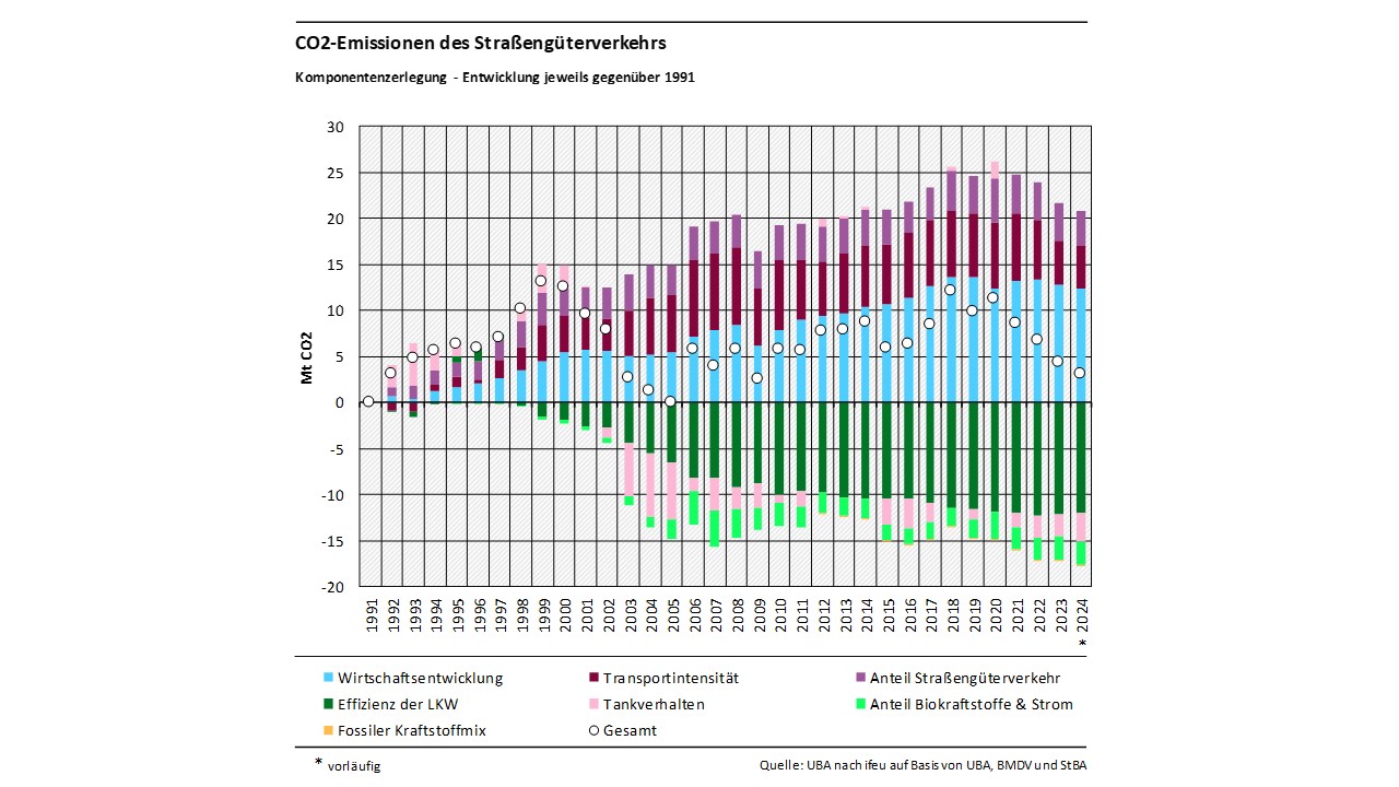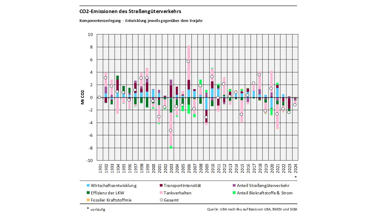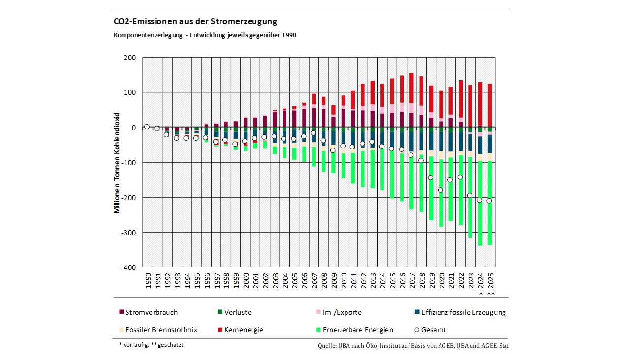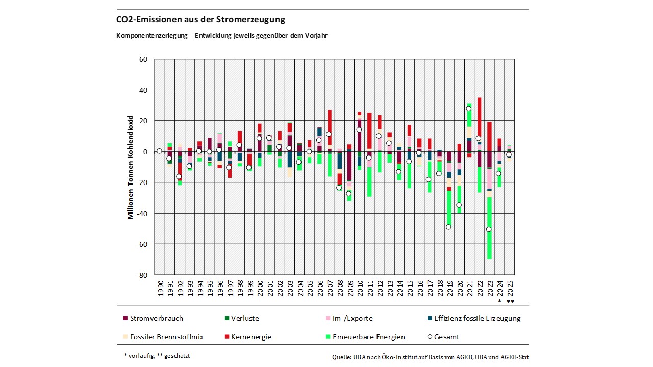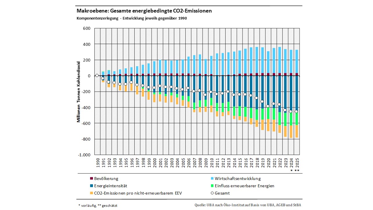 Die Komponentenzerlegung erfolgt in zweifacher Art und Weise: Zum einen werden die jährlichen Beiträge der einzelnen Komponenten jeweils gegenüber einem definierten Ausgangsjahr dargestellt, zum anderen wird die jährliche Entwicklung der einzelnen Treiber jeweils gegenüber dem Vorjahr dargestellt. Dabei werden – entsprechend der Konvention im nationalen Treibhausgasinventar – ausschließlich die direkten, territorialbasierten CO₂-Emissionen betrachtet. Somit sind (anders als etwa bei der Emissionsbilanz erneuerbarer Energieträger) die vorgelagerten, teilweise im Ausland entstehenden Emissionen nicht Teil der Betrachtung. Eine weiterführende Erläuterung zur Methodik und eine mathematische Definition der einzelnen Treiber kann dem 3. Teilbericht des Forschungsvorhabens „Komponentenzerlegung energiebedingter Treibhausgasemissionen mit Fokus auf dem Ausbau erneuerbarer Energien“ entnommen werden.