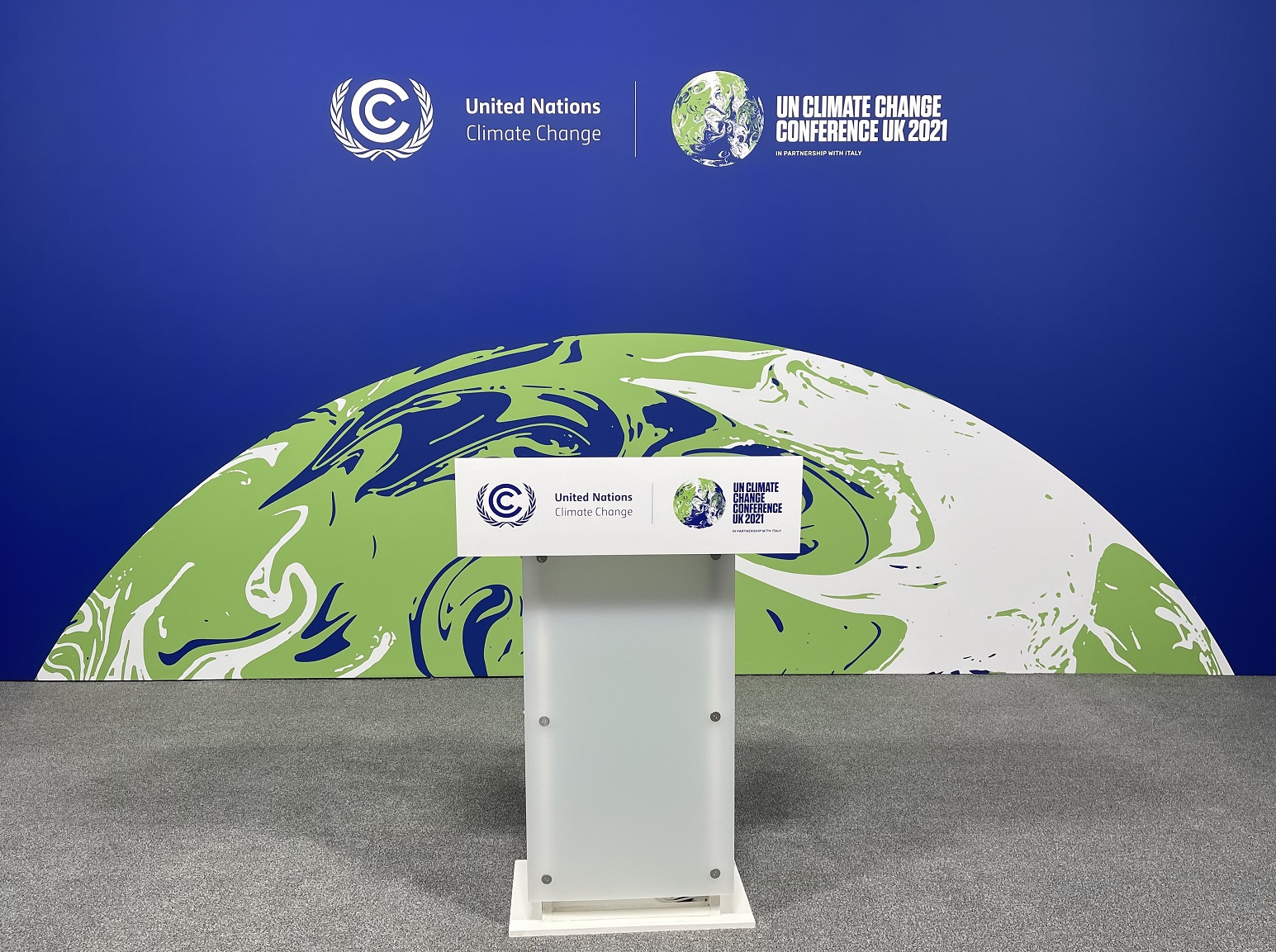 Rednerpult mit der Aufschrift "UN Climate Change Conference UK 2021", im Hintergrund eine Aufstellwand mit derselben Aufschrift und einer Erdkugel
