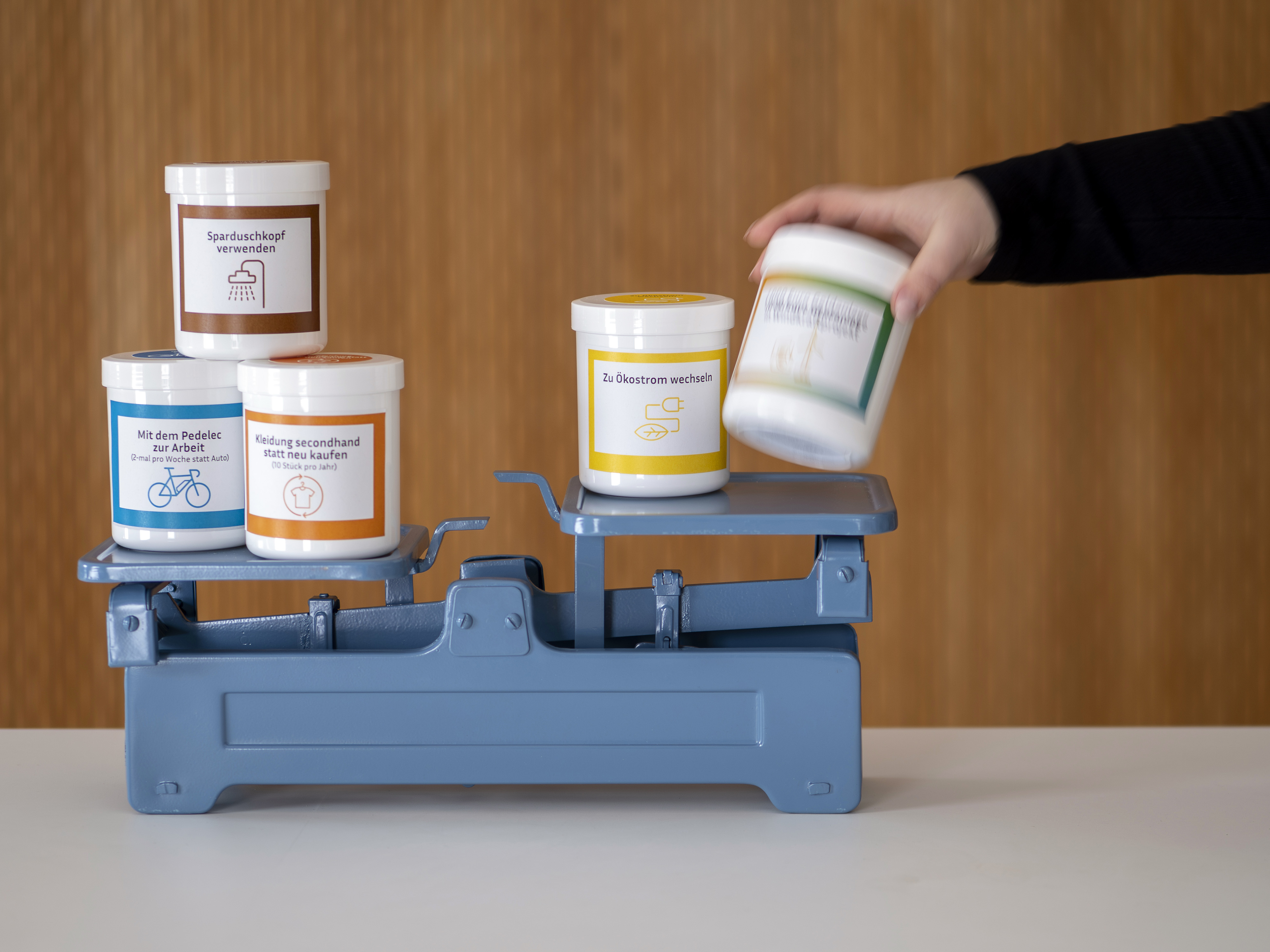 Die Klimawaage zeigt spielerisch anhand verschiedener, beschrifteter Dosen, die gegeneinander abgewogen werden können,, wie Alltagsentscheidungen das Klima beeinflussen.