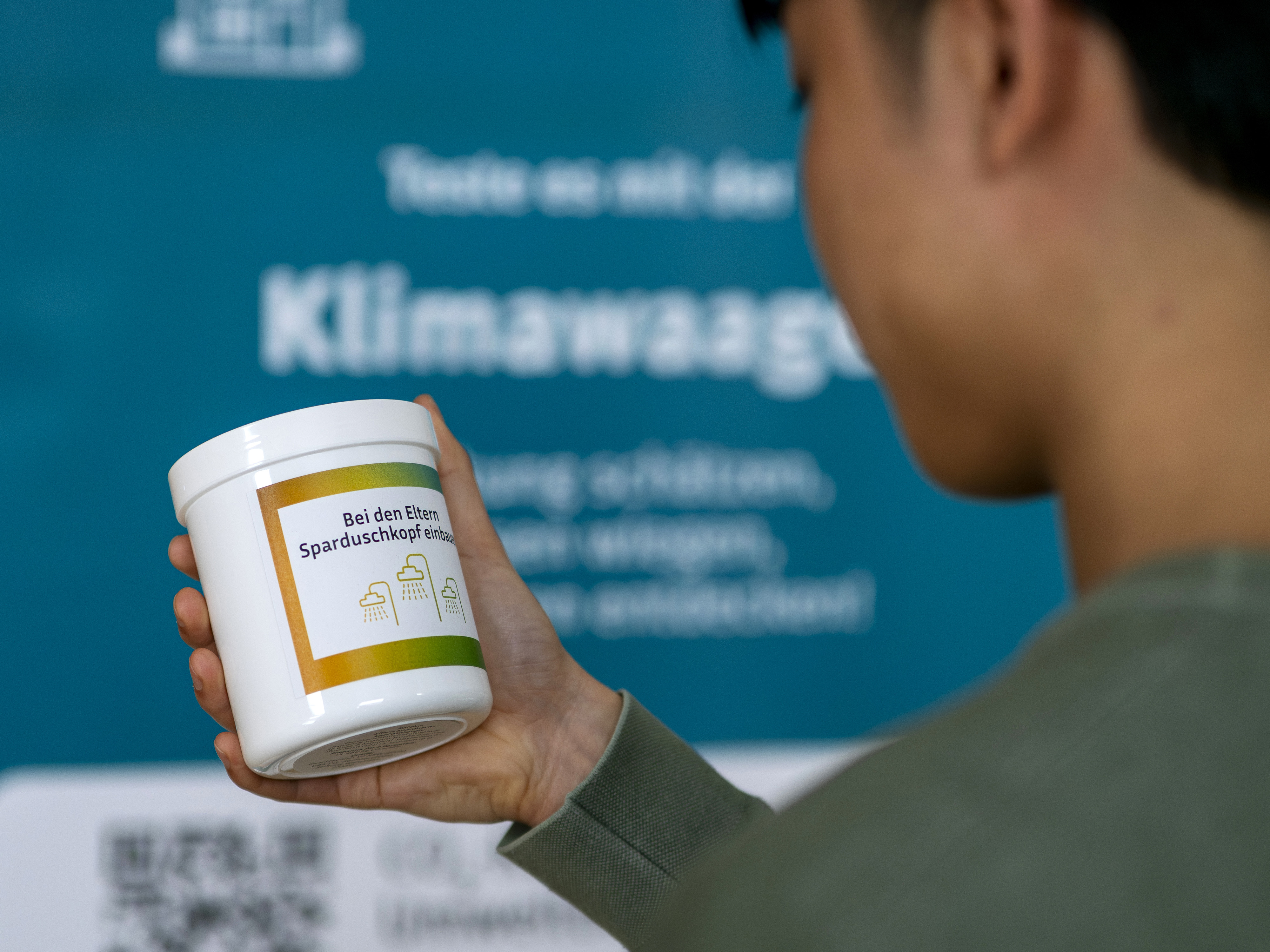 Neben der Reduktion des eigenen CO₂‑Fußabdrucks rückt die Klimawaage 2.0 stärker die gesellschaftliche Wirkung des Handelns in den Mittelpunkt. Die neue Kategorie „Handabdruck“ umfasst Aktivitäten, die gemeinschaftliches Engagement fördern – etwa die Einführung von Recyclingpapier an Schulen, das Mitwirken an einer lokalen Naturschutzinitiative oder andere Menschen für Klimaschutzmaßnahmen zu begeistern. Da viele dieser Wirkungen nicht exakt berechnet werden können, setzt die Klimawaage auf kreative Lösungen: Einige Dosen enthalten akustische Überraschungen oder bleiben leer und laden Nutzer*innen dazu ein, selbst Gewicht zuzuordnen und ins Gespräch zu kommen.