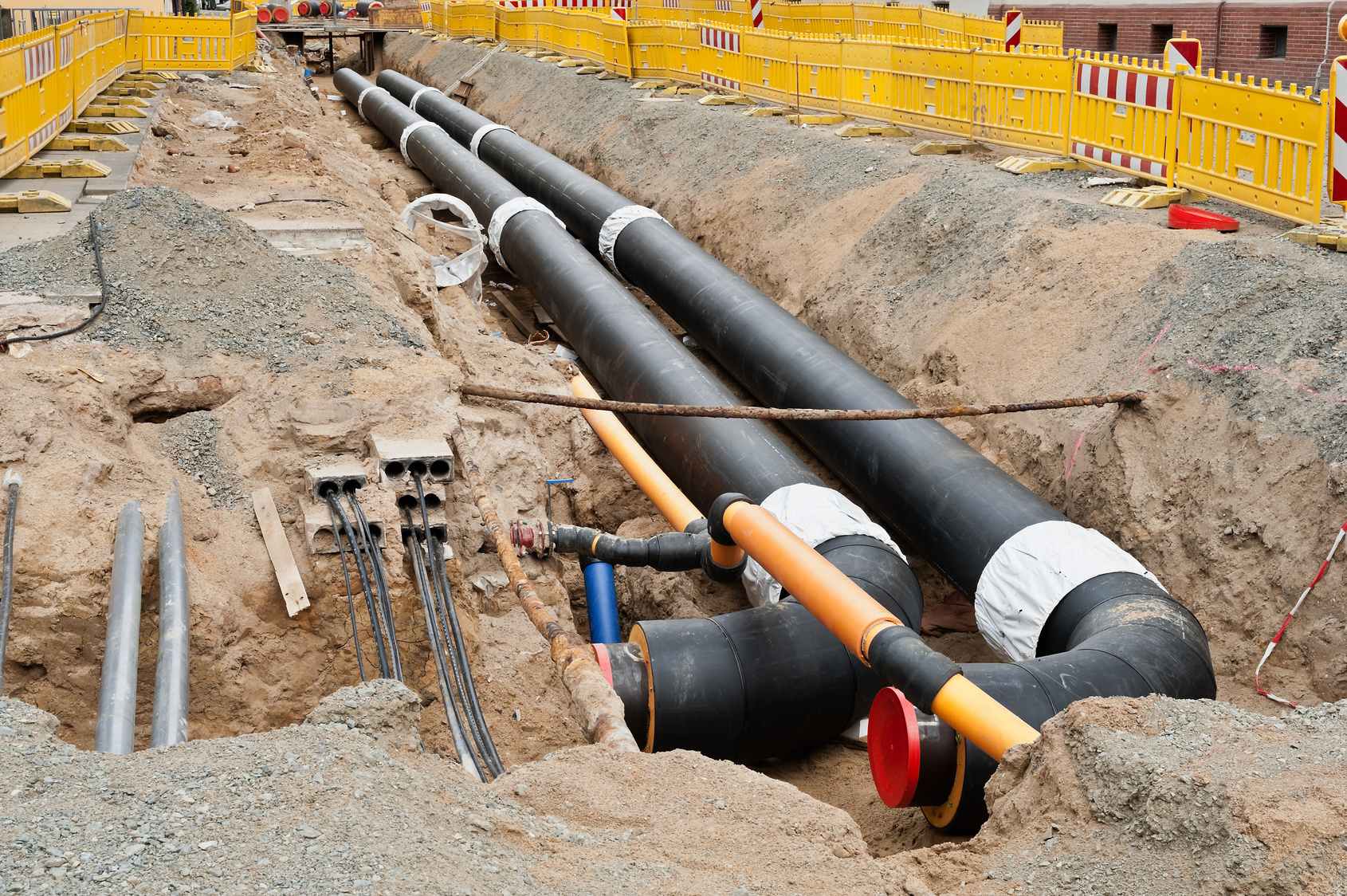 Foto einer Baustelle mit freigelegten Fernwärmeleitungen im Erdreich