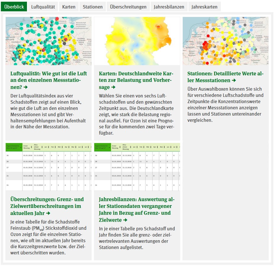 Neben der Information über die aktuelle Luftqualität umfasst das Luftdatenportal auch zeitliche Verläufe der Schadstoffkonzentrationen, tabellarische Auflistungen der Belastungssituation an den deutschen Messstationen, einen Index zur Luftqualität sowie Jahresbilanzen für die einzelnen Schadstoffe.