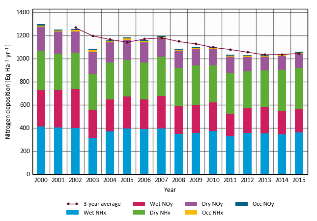 Wie in Abb. 2.1 zu sehen, nimmt die deutschlandweite Stickstoffdeposition seit dem Jahr 2000 kontinuierlich ab. Dies ist vor allem durch die Minderung von Stickstoffoxidemissionen in der Industrie und der Energie- und Wärmeerzeugung zurückzuführen, wodurch eine Abnahme der nassen („wet_NOy“) und der trockenen („dry_NOy“) Deposition von oxidierten Stickstoffverbindungen zu verzeichnen ist. Im selben Zeitraum haben sich die trockene und nasse Deposition von reduziertem Stickstoff („wet_NH4“ und „dry_NH4) kaum verändert, was auf sich kaum veränderte Emissionen von Ammoniak in der Landwirtschaft zurückzuführen ist.