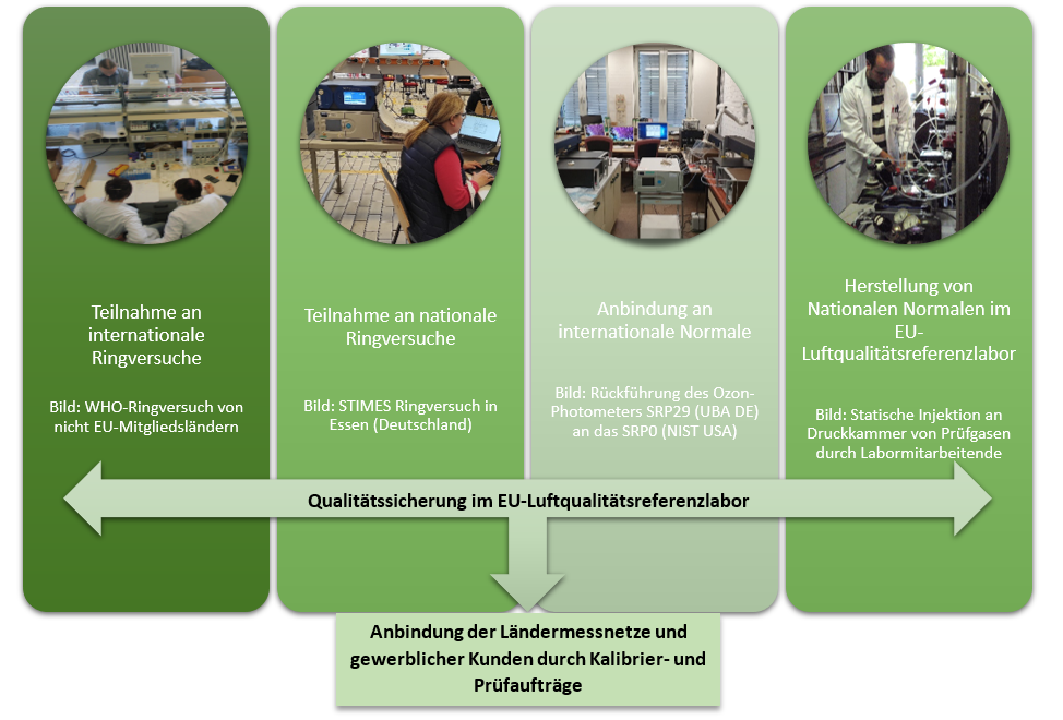 Die Qualitätssicherung stützt sich auf verschiedene Säulen um die Gültigkeit und Richtigkeit der Messergebnisse zu sichern. Dies sind zum einen Ringversuche, bei denen eine identische Probe von verschiedenen Laboren untersucht wird. Das ermöglicht einen Vergleich der Messinstitute. Die Ergebnisse geben Auskunft über die Messgenauigkeit und die Messfähigkeit der beteiligten Einrichtungen. Zum Zweiten setzt vergleichbares Messen eine einheitliche und gleiche Bezugsgrößen voraus. Diese internationalen oder nationalen anerkannten Größen nennt man Normale. Die Normale für die Messung von gasförmigen Schadstoffen in der Luft werden vom nationalen EU-Referenzlabor des UBA zur Verfügung gestellt.