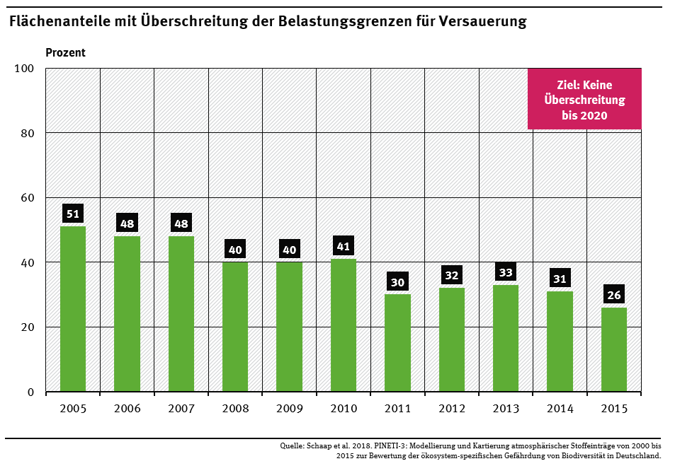 Die Luftreinhaltekonvention trug wesentlich zur Durchsetzung emissionsmindernder Maßnahmen in den Unterzeichnerstaaten bei. Durch die Einführung der Rauchgasentschwefelung und schwefelarmer Brennstoffe konnte der Ausstoß von Schwefel in die Atmosphäre in Europa und Deutschland seit 1990 um etwa 95 Prozent verringert werden. Die geringeren Einträge von Säure wirken sich positiv in den Ökosystemen aus. Die Ökosystemflächen Deutschlands mit Versauerungsrisiko (Critical Loads-Überschreitung siehe Abbildung) verminderten sich im Zeitraum von 2005 bis 2019 um mehr als 25 Prozent. Oberflächengewässer in Deutschland erholen sich allmählich von den Schäden durch Versauerung, empfindliche Organismen kehren in die Lebensräume zurück . Böden reagieren langsamer als Gewässer. Die Ergebnisse der zweiten Bodenzustandserhebung im Wald (Thünen Report 43, 2016) belegen jedoch im Vergleich zur ersten Erhebung in den 1990er Jahren erste Erholungstendenzen. In den noch verbliebenen Regionen mit Versauerungsrisiko kann eine Verbesserung vor allem durch Minderung der Stickstoffeinträge in die Ökosysteme erreicht werden.