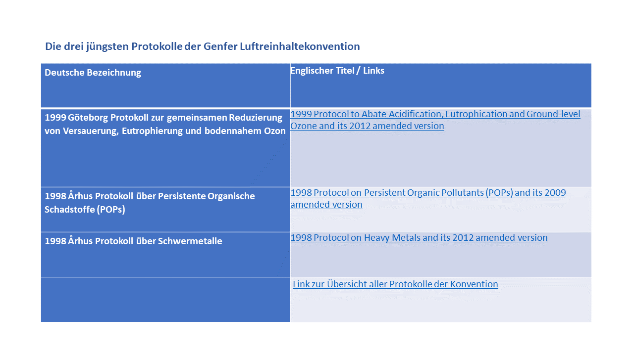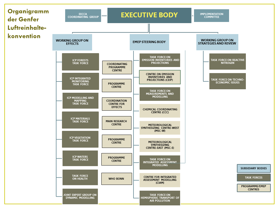In den 1970 er Jahren rüttelten Schlagzeilen über das “Waldsterben” in Deutschland und Mitteleuropa oder große Fischsterben in skandinavischen Gewässern die Öffentlichkeit auf. Umweltbeobachtung und Atmosphärenforschung wiesen nach, dass Luftschadstoffe weiträumig und grenzüberschreitend transportiert werden und fernab vom Emissionsort Umwelt- und Gesundheitsrisiken verursachen. Um diese grenzüberschreitenden Umweltbelastungen zu mindern, unterzeichneten 1979 dreißig europäische Länder, die USA und Kanada unter Schirmherrschaft der Wirtschaftskommission der Vereinten Nationen für Europa (UNECE) die Genfer Luftreinhaltekonvention (Convention on Long-range Transboundary Air Pollution, CLRTAP ). Inzwischen arbeiten 51 Staaten Europas und Vorderasiens, die USA und Kanada, als auch die Europäische Union als „Vertragsparteien“ erfolgreich in der Konvention zusammen.