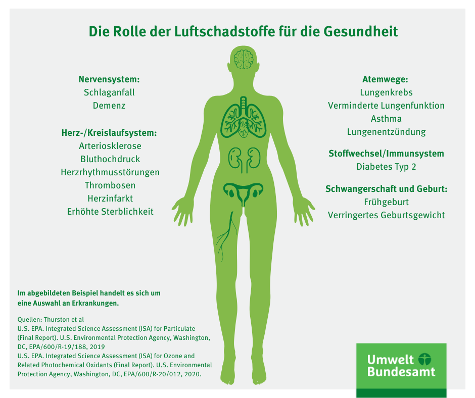 Gemessen an den WHO Richtwerten sind in Deutschland insbesondere die Konzentrationen von Stickstoffdioxid und Feinstaub noch immer zu hoch. Auch die Konzentrationen von Ozon können so hoch sein, dass gesundheitliche Wirkungen zu befürchten sind.