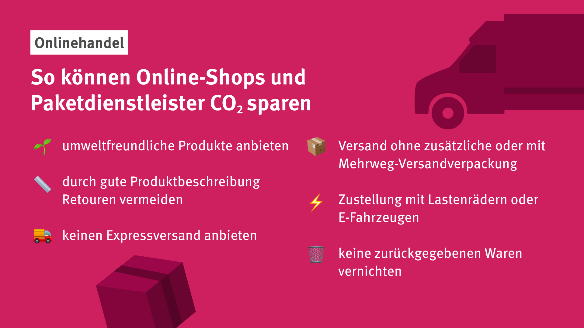 Im Forschungsprojekt „Ökologisierung des Onlinehandels“ hat das Umweltbundesamt eine Roadmap entwickeln lassen, um den Onlinehandel klimafreundlicher zu gestalten. Viele Maßnahmen bei Retouren, Versandverpackungen und Logistik liegen bei Wirtschaftsakteuren und der Politik, aber auch Kundinnen*Kunden können durch ihr Verhalten zur Klimaentlastung beitragen.
