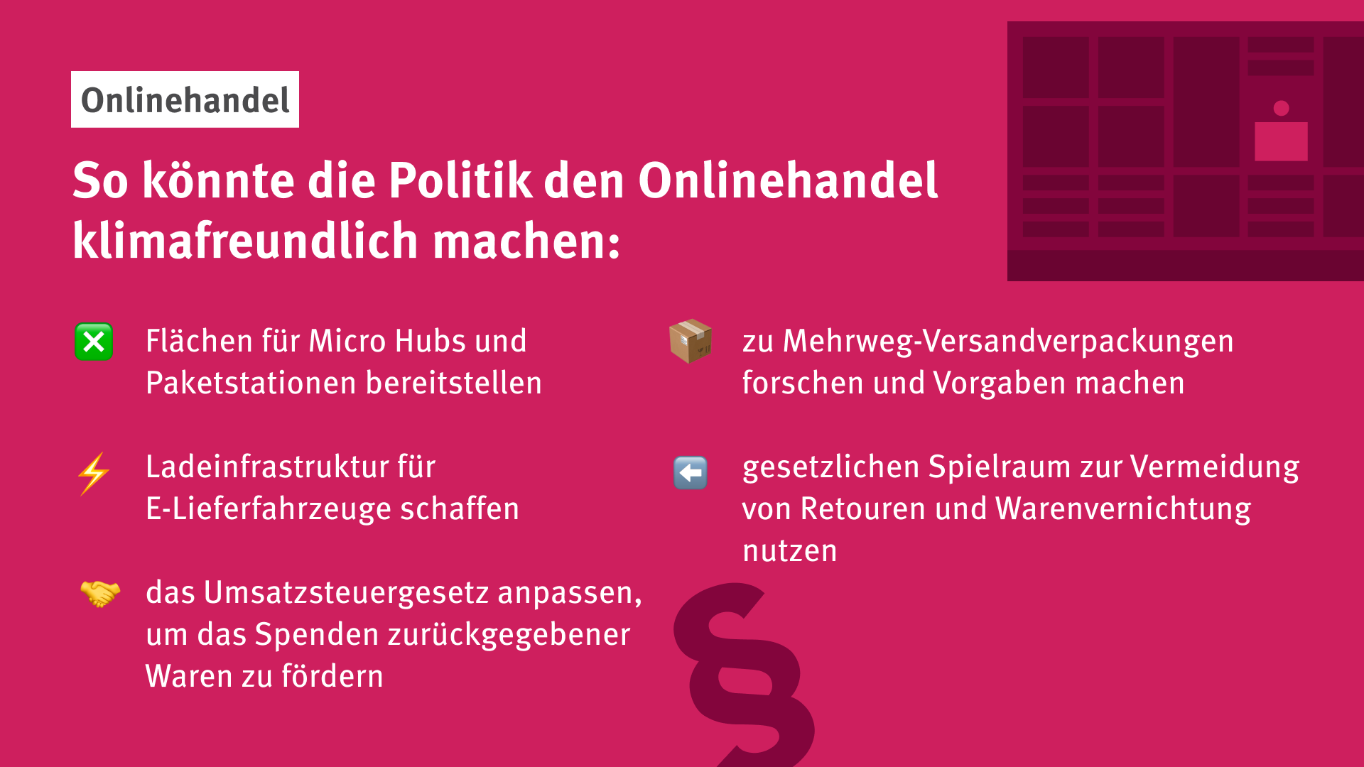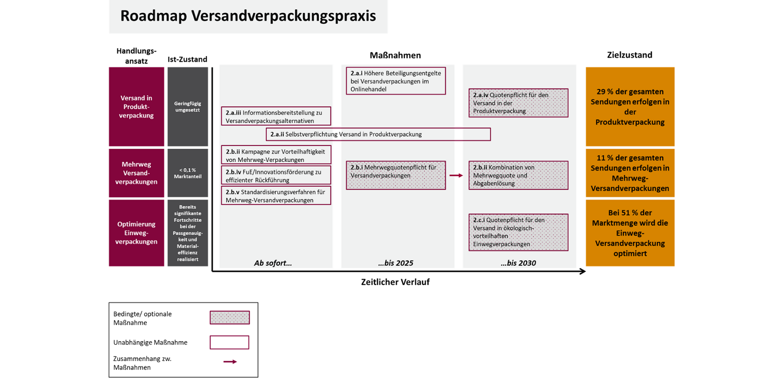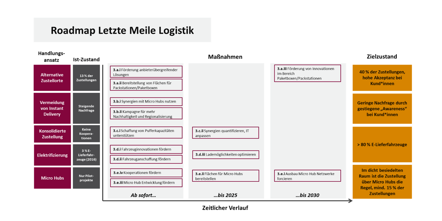 Die Roadmap enthält eine Vielzahl an detaillierten Maßnahmenvorschlägen für Politik, Handel, Zusteller und Kundinnen*Kunden, wie die Potenziale ausgeschöpft werden können, zum Beispiel: