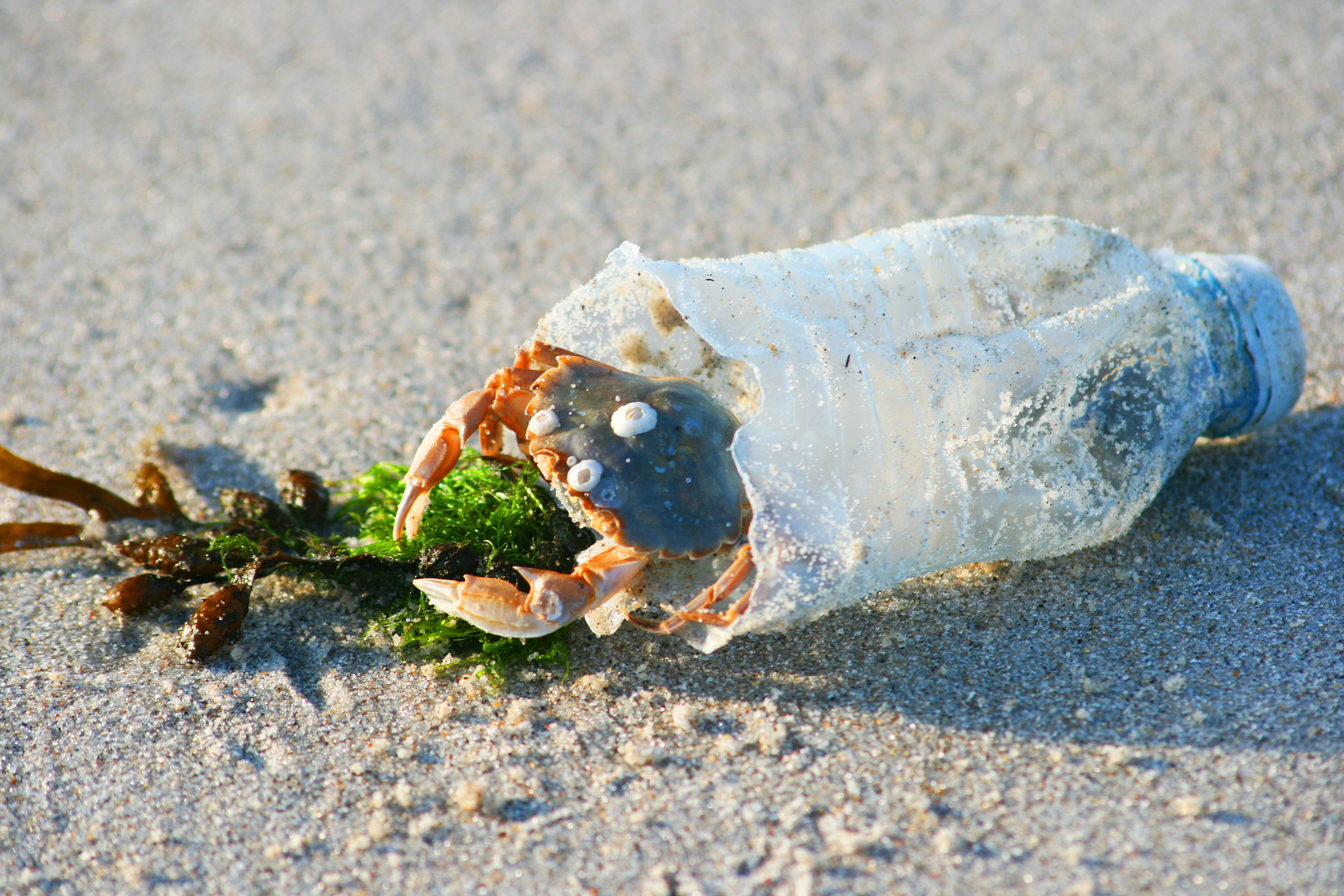 eine Krabbe auf einem Sandstrand sitzt in einer kaputten Plastikflasche