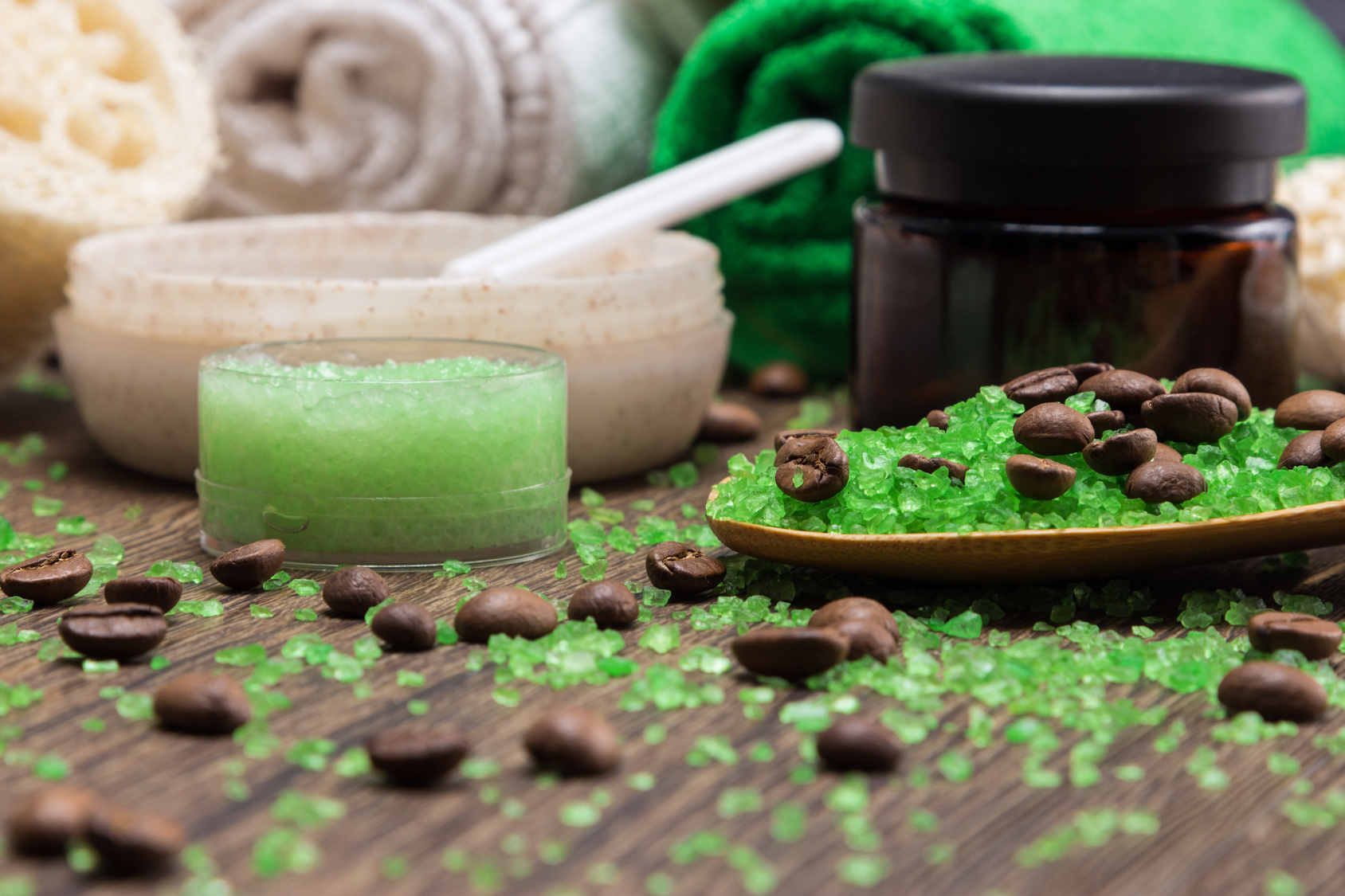 Kosmetiktiegel und Handtücher mit grünen Kügelchen und Kaffebohnen auf einer Holzoberfläche arrangiert