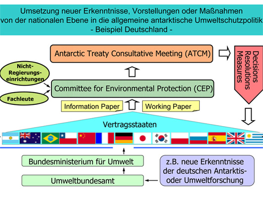 Wie die Umsetzung neuer Forschungsergebnisse, Erkenntnisse oder Maßnahmen von der nationalen Ebene in die internationale antarktische Umweltschutzpolitik funktioniert, können Sie am Beispiel Deutschlands im nachfolgenden Schema sehen.