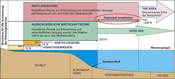 Im Zusammenhang mit der Arktis ist in den letzten Jahren der Begriff des so genannten Festlandsockels vermehrt in den Medien aufgetaucht: Der Festlandsockel stellt die die gesamte natürliche Verlängerung eines Landgebietes bis zur äußeren Kante des Festlandrandes unterhalb der Wasseroberfläche dar. Laut SRÜ umfasst er den Meeresboden und Meeresuntergrund jenseits des Küstenmeeres bis zu einer Entfernung von 200 Seemeilen und entspricht damit eigentlich dem Gebiet der AWZ. Innerhalb dieses definierten Festlandsockels werden dem jeweiligen Staat hoheitliche Rechte zur Erforschung und wirtschaftlichen Nutzung der Ressourcen am und unter dem Meeresboden eingeräumt. Dieser Festlandsockel kann bis zu 350 Seemeilen (ab der Basislinie) erweitert werden. Die Voraussetzung dafür ist, dass der Staat beweisen kann, dass „(…)die geologische Struktur des Kontinental-/Festlandsockels eine Erweiterung seiner Landmasse darstellt.“ Dem Festlandsockel folgt dann ab 350 Seemeilen von der Basislinie entfernt „das Gebiet“ („The Area“), das aus dem Meeresboden und dem Untergrund besteht und rechtlich keinem Staat zugeordnet ist. Es gilt als „Gemeinsames Erbe der Menschheit“.