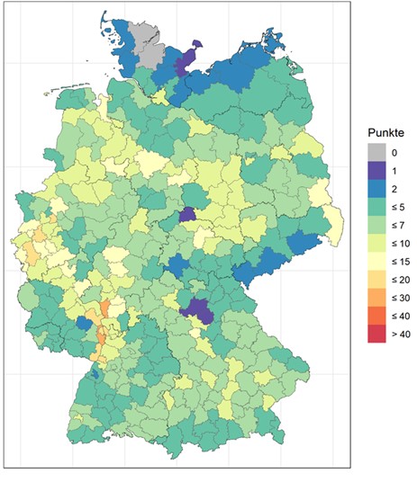 Zusätzlich werden die Grundwassergewinnungsindizes auf Ebene der Landkreise und kreisfreien Städte (NUTS-3-Regionen) innerhalb von Deutschland und für das Jahr 2019 bereitgestellt. Der GWGI beschreibt Zusammenhänge zwischen Grundwasserneubildung und Grundwassergewinnung, basierend auf dem erneuerbaren Grundwasserdargebot. Dabei handelt es sich um Niederschlag und Zusickerung aus Oberflächengewässern.