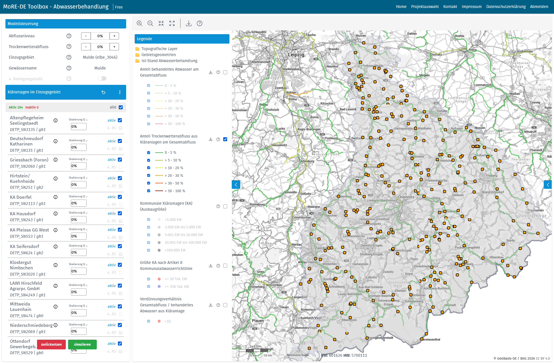 Mit einem ergänzenden Simulationsmodul können für ein ausgewähltes Einzugsgebiet eines Gewässerabschnitts oder für eine Kläranlage die Auswirkungen sich ändernder Abflussverhältnisse simuliert werden.