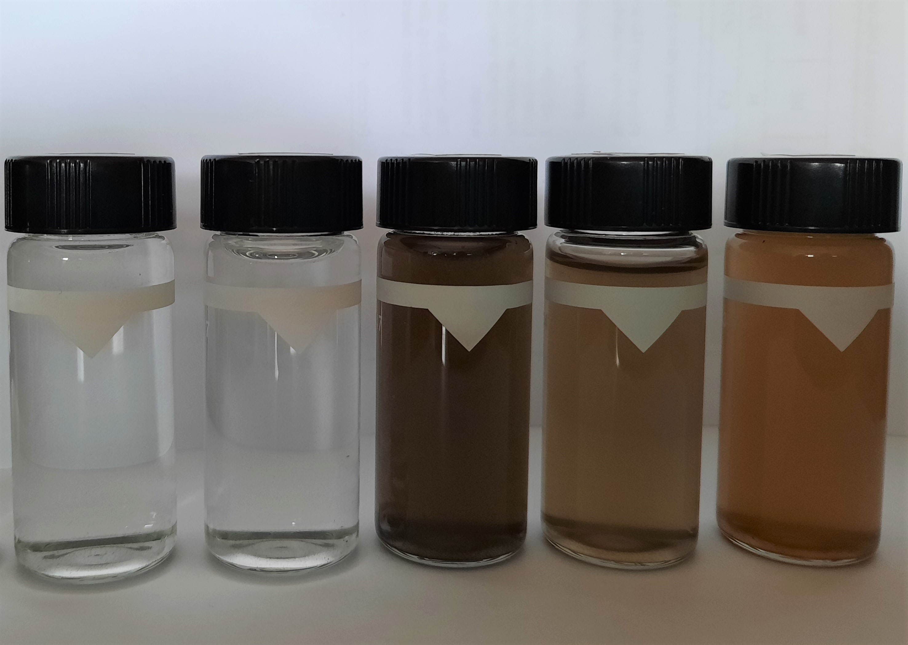 Fünf Labor-Flaschen mit unterschiedlich gefärbter Flüssigkeit von durchsichtig bis braun-schwarz