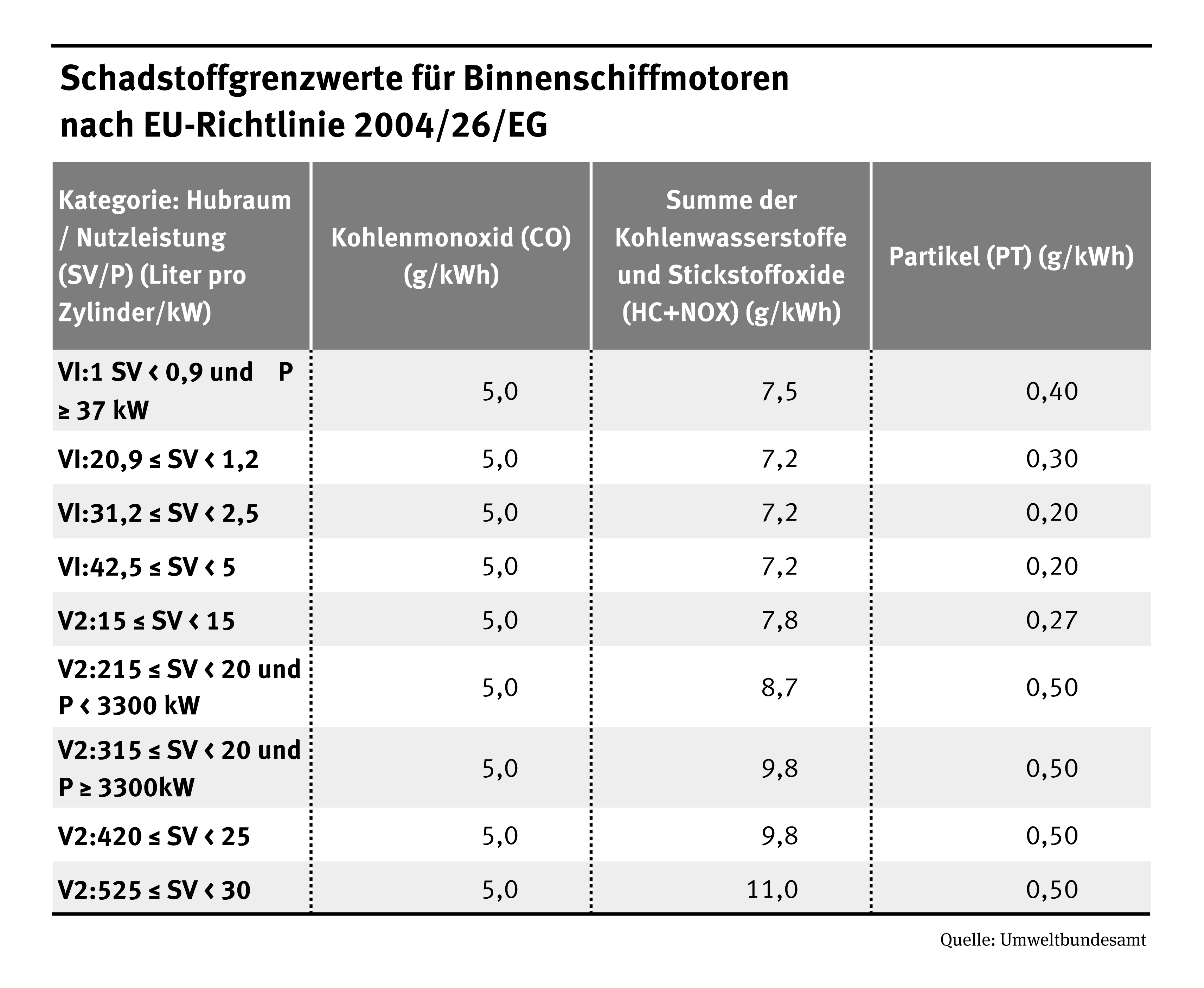 Im Vergleich zu einem 40-Tonnen-Sattelzug verbrauchen Bahn und Schiff weniger als ein Drittel an Energie und stoßen entsprechend weniger Treibhausgase aus. In der Luftschadstoffbilanz ist der Transport per Binnenschiff jedoch schlechter als per Lkw. Wesentlich geringere Emissionen würden im Fall einer Modernisierung der Schiffsflotte eintreten. Da die Erneuerungsrate der Binnenschiffflotte jedoch sehr gering ist, wird die Schadstoffminderung im Schiffsbestand durch die Flottenmodernisierung mittelfristig sehr gering sein. Alte Binnenschiffe sind zum Teil noch sehr viele Jahre im Einsatz und die wenigen neu hinzukommenden Stufe V-Motoren werden daher erst langfristig zur Luftverbesserung beitragen.