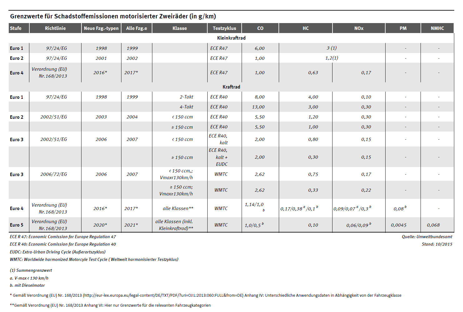 Mit der Richtlinie 2013/60/EU der Kommission vom 27. November 2013 zur Anpassung von Richtlinie 97/24/EG wurde der Kaltstart für zwei- und dreirädrige Kleinkrafträder und leichte vierrädrige Kraftfahrzeuge mit einbezogen. Ab Januar 2016 gilt die neue EU-Verordnung 168/2013. Sie enthält sehr ambitionierte Emissionsstandards unter anderem für Motorräder und Mopeds bis zu Emissionsstufe Euro 5. Hier sind bis zum Jahr 2020 Grenzwerte für Verdunstungsemissionen (HC), Onbord-Diagnose (OBD), Lärm und Dauerhaltbarkeitsanforderungen in Bezug auf die Emission mindernden Bauteile vorgeschrieben. Für Motorräder der Klasse L3e gelten die Abgasgrenzwerte der Stufe Euro 4 ab dem 1.1.2016, die Grenzwerte der Euro 5 ab dem 1.1.2020. Mit der Verordnung (EU) Nr. 134/2014 vom 16. Dezember 2013 wurden die Durchführungsbestimmungen zur Ergänzung der Verordnung (EU) Nr. 168/2013 in Bezug auf in Bezug auf die Anforderungen an die Umweltverträglichkeit und die Leistung der Antriebseinheit festgelegt.