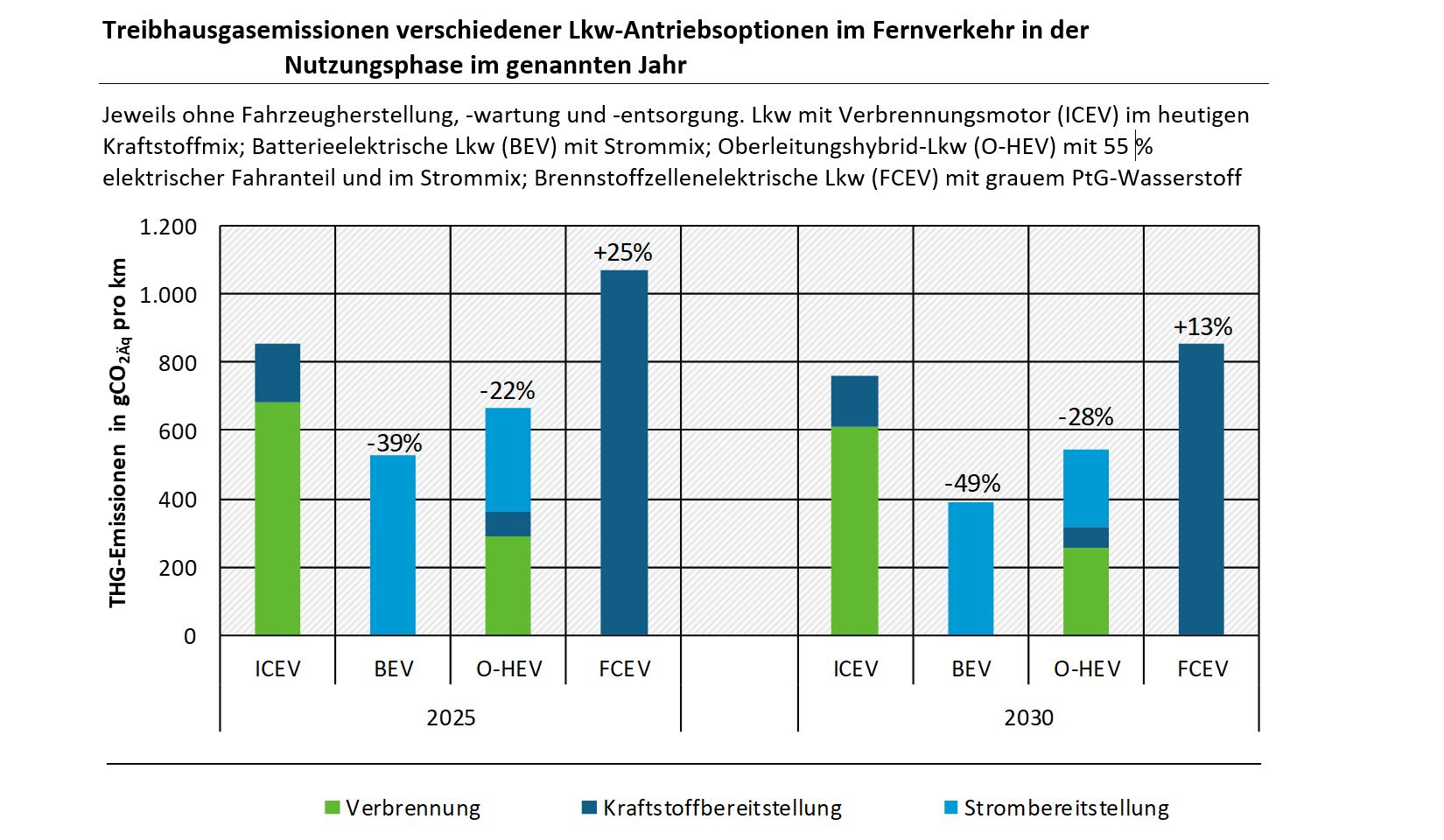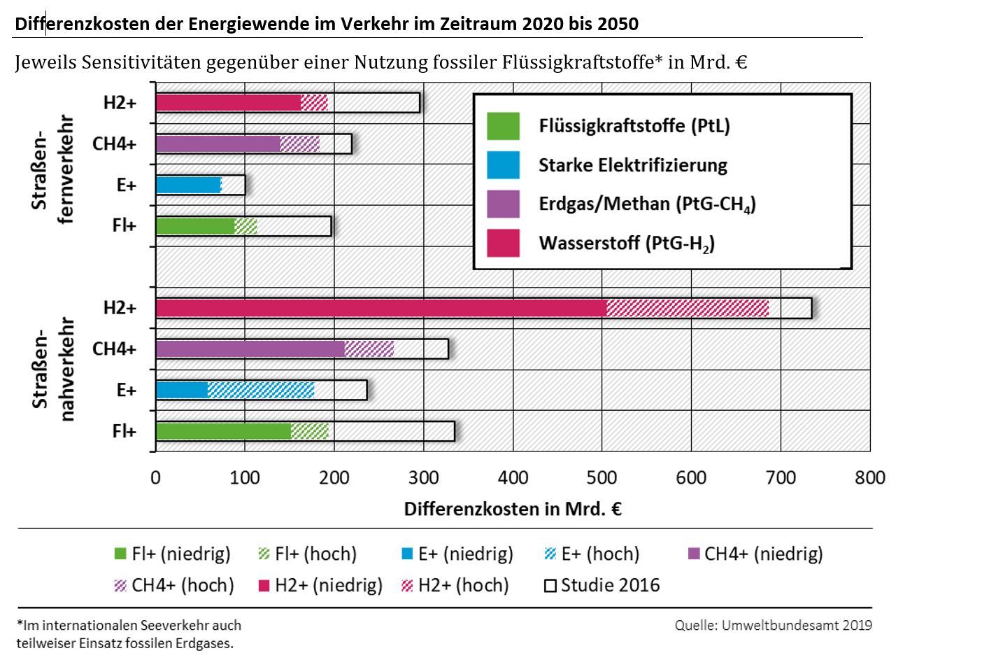 Im Vergleich zur Nutzung von grünem Wasserstoff im Verkehr ist die direkte Nutzung von erneuerbarem Strom in batterieelektrischen Fahrzeugen energieeffizienter, kostengünstiger und klimafreundlicher. Im Straßenverkehr ist die Nutzung von grünem Wasserstoff sogar die volkswirtschaftlich teuerste Option aller postfossilen Antriebe und Kraftstoffe, die langfristig einen treibhausgasneutralen Verkehr ermöglichen. Wasserstoff im Verkehr sollte daher, wenn überhaupt nur in den Bereichen eingesetzt werden, in denen eine direkte Nutzung von erneuerbarem Strom nicht möglich ist. Dies ist insbesondere dann der Fall, wenn ein hoher Energiebedarf oder große Reichweiten erforderlich sind, wie beispielsweise im Seeverkehr, im internationalen Flugverkehr oder unter bestimmten Umständen im Straßengüterfernverkehr. Der Schienenverkehr kann mindestens mittelfristig nahezu vollelektrisch betrieben werden – ein Markthochlauf des Einsatzes von grünem Wasserstoff oder der Brennstoffzelle ist hier nicht notwendig.