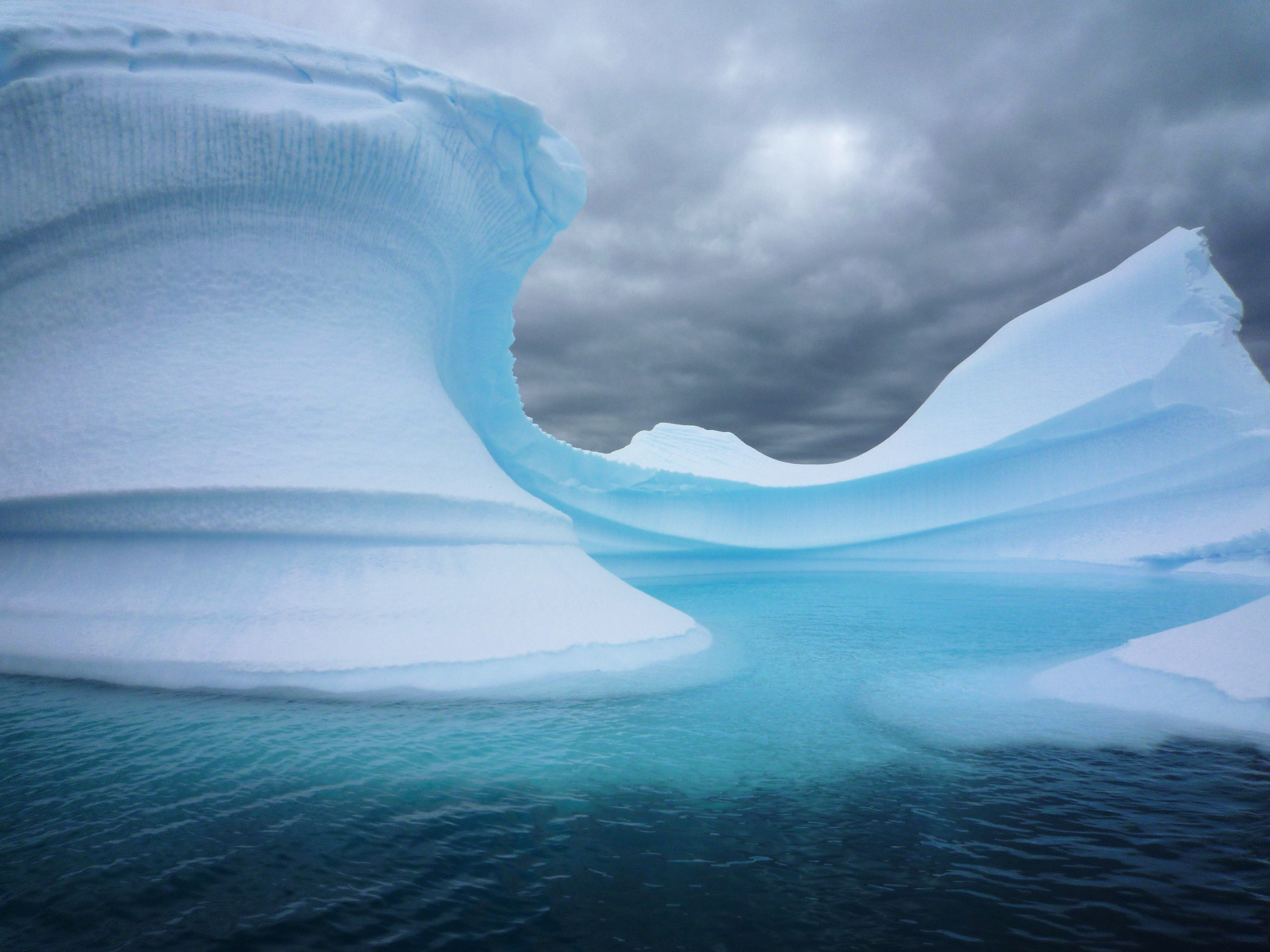 Vor dunkel bewölktem Himmel ragt ein weiß-blauer Eisberg auf. Er ist geschwungen. Das Wasser um ihn ist dunkelblau.