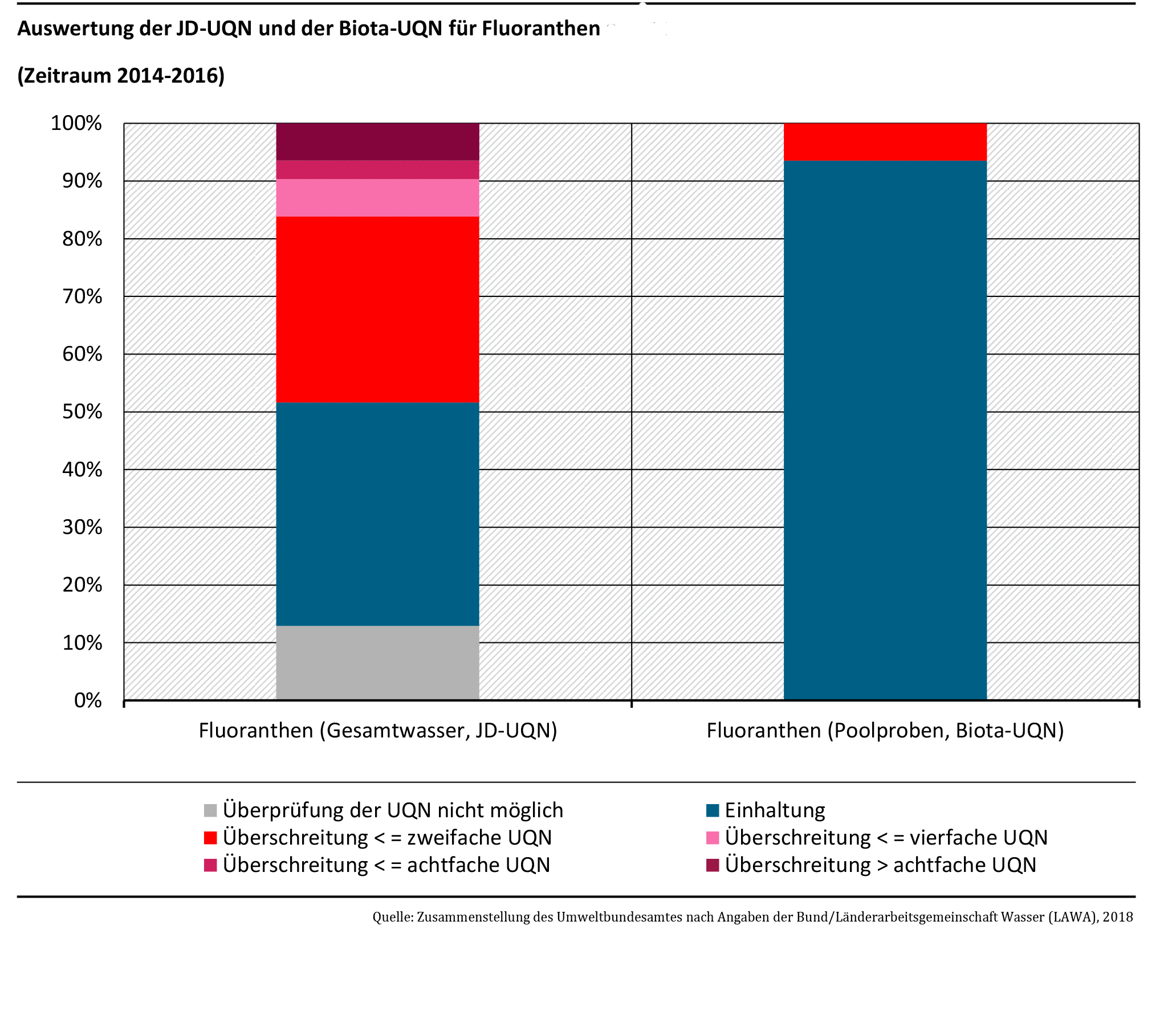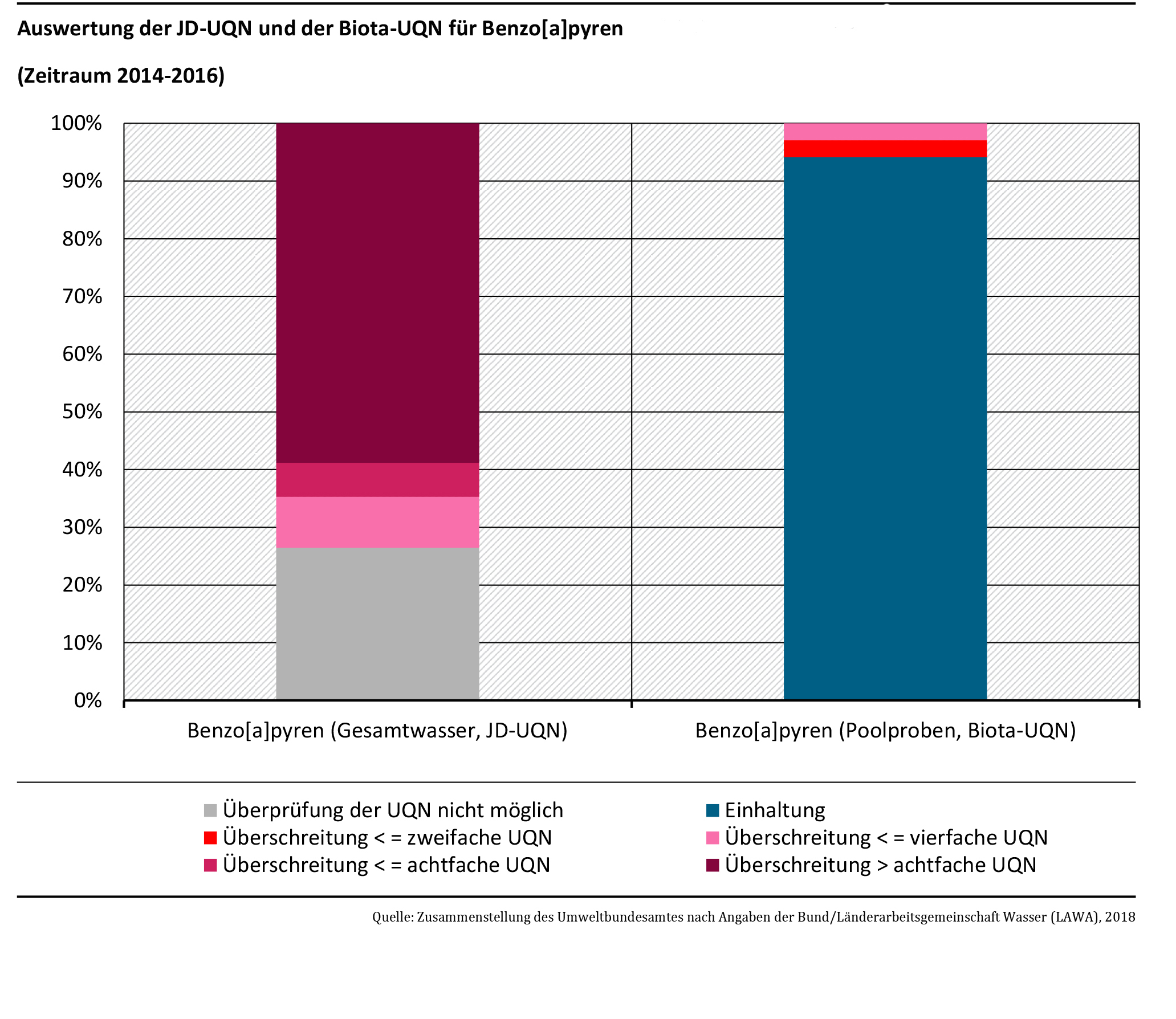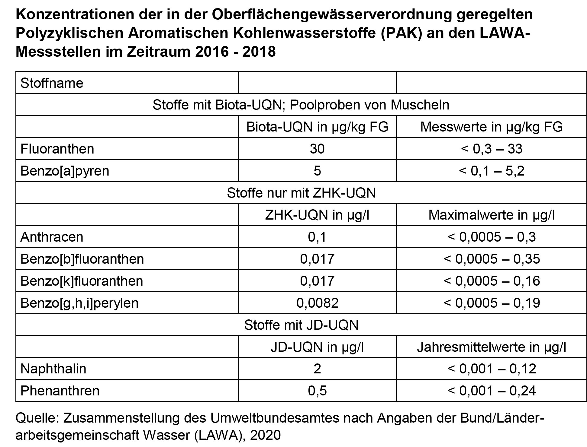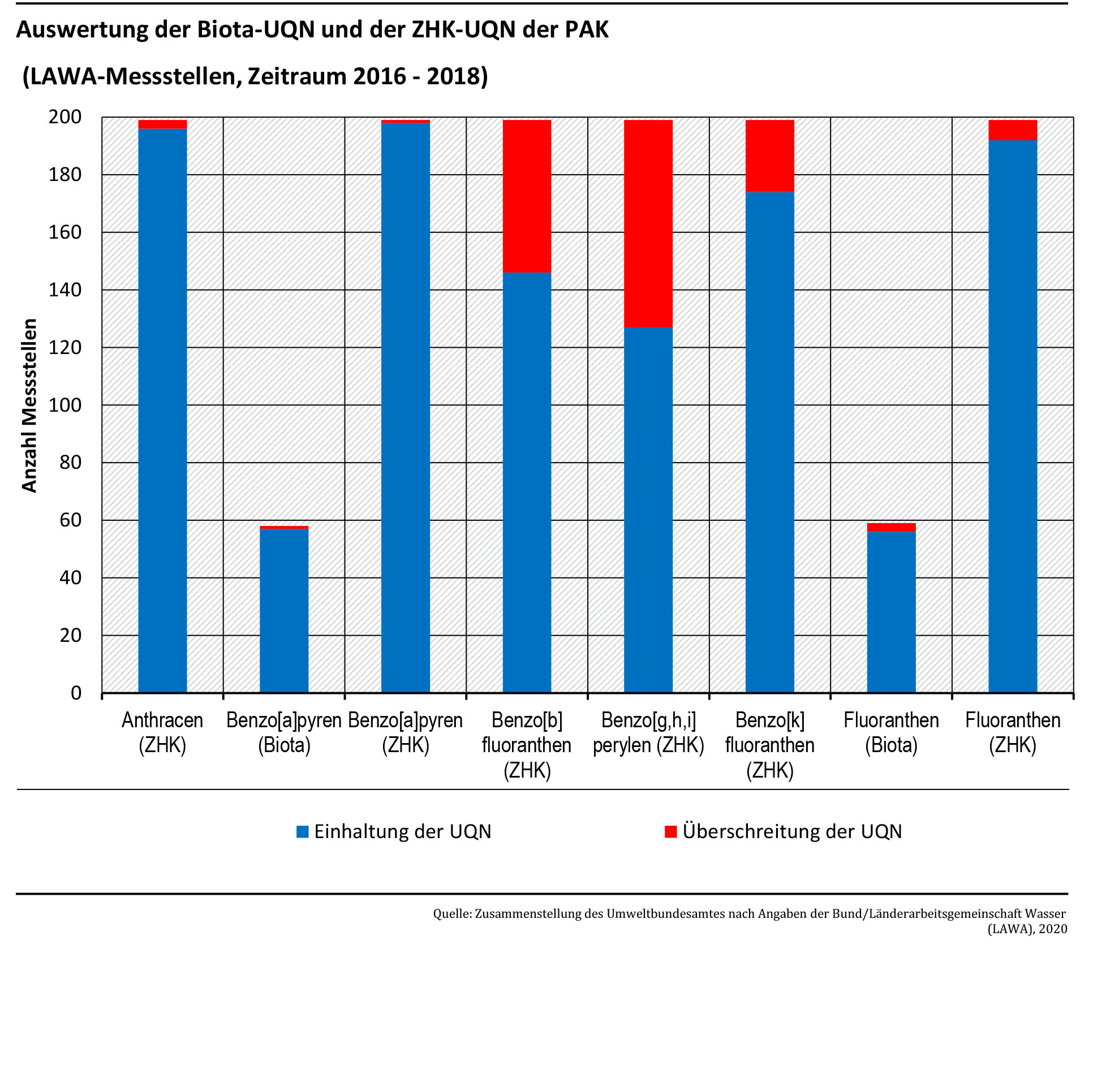 Neun der PAK16 sind in der Oberflächengewässerverordnung geregelt. Die UQN für Phenanthren und Naphthalin werden im Zeitraum 2016-2018 an allen LAWA-Messstellen eingehalten. Die Konzentrationen von Fluoranthen und Benzo[a]pyren werden sowohl anhand der Konzentration in Muscheln (Biota-Umweltqualitätsnorm (Biota-UQN)) als auch der Konzentrationen der Gesamtwasserphase (zulässige Höchstkonzentration (ZHK-UQN)) bewertet. Überschreitungen treten für diese beiden Stoffe sowohl für die Biota-UQN als auch für ZHK-UQN auf. Die ZHK-UQN wird bei Anthracen vereinzelt und bei Benzo[b]fluoranthen, Benzo[k]fluoranthen und Benzo[g,h,i]perylen häufiger überschritten.