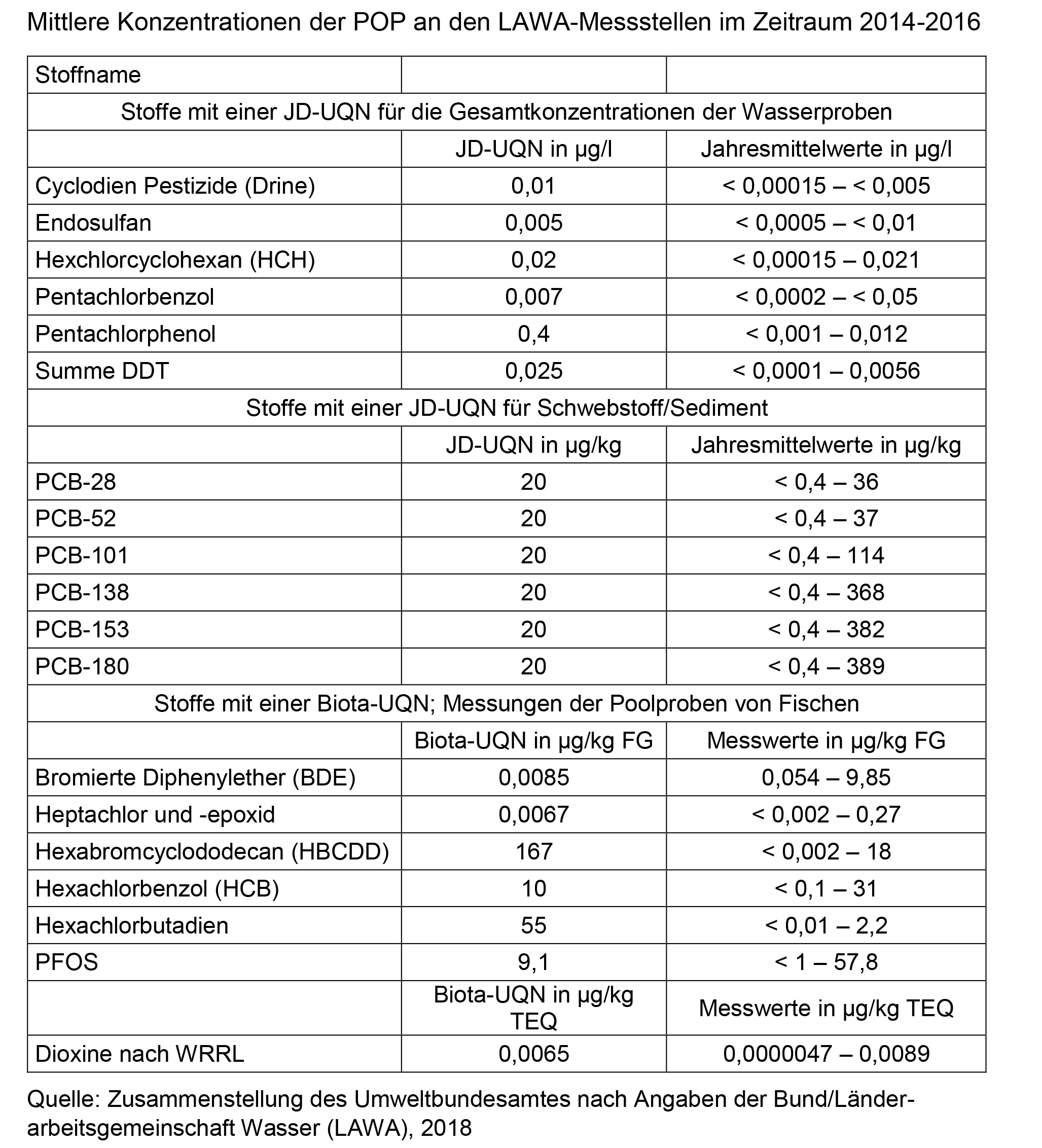 Für einige dieser 14 POP gelten schon seit den 1980er Jahren Anwendungsverbote oder Einschränkung der Produktion, Verwendung und Freisetzung in Deutschland. Wegen ihrer Langlebigkeit sind die Konzentrationen in der Umwelt immer noch sehr hoch. Bei Hochwasserereignissen oder Baggerarbeiten im Gewässer oder Uferbereich können höher belastete Sedimente remobilisiert werden. So sind für HCH und HCB immer noch Konzentrationsschwankungen in den Schwebstoffen in Elbe und Mulde festzustellen.