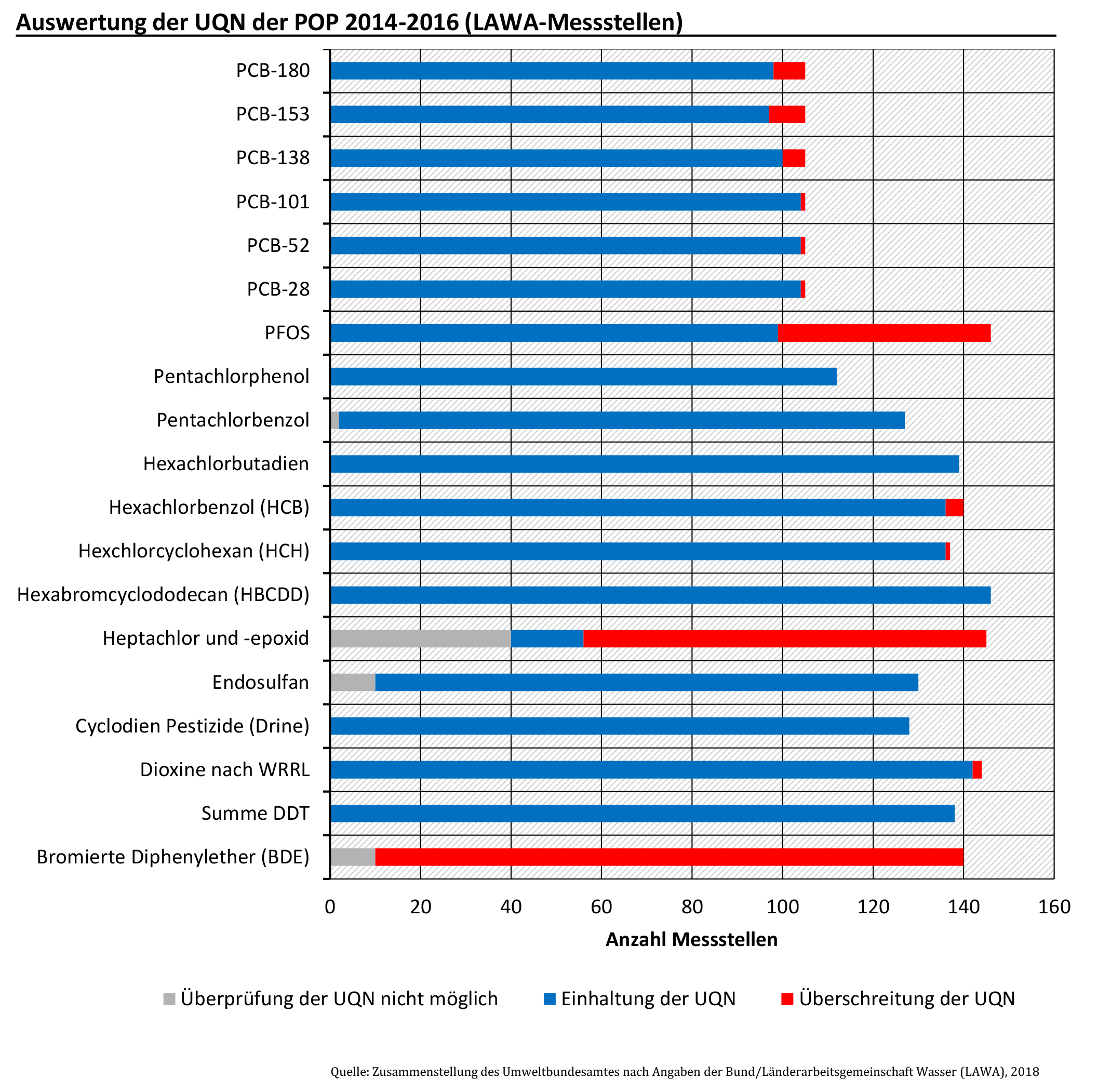 Bei der Summe der Hexachlorcyclohexane (HCH), den Dioxinen, PCB28, PCB52, PCB101, PCB138, PCB153, PCB180 und HCB ist an ein bis sieben Messstellen eine Überschreitung festzustellen. Die Biota-UQN wird bei der Summe der BDE an allen Messstellen und für Heptachlor/Heptachlorepoxid an 85 % der Messstellen, bei denen Messwerte größer der Bestimmungsgrenze ermittelt wurden, überschritten. An rund einem Drittel der Messstellen wird die Biota-UQN für PFOS überschritten.
