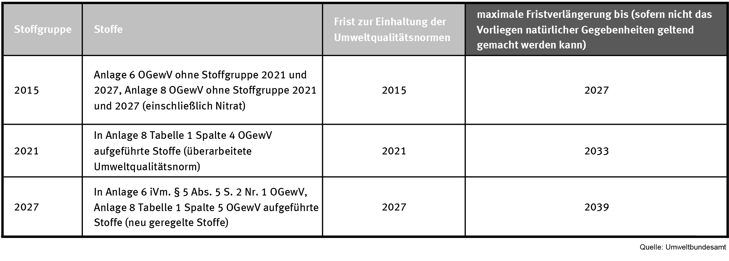 Durch die Änderung von Umweltqualitätsnormen bei den Stoffen der Anlagen 6 und 8 oder durch die Aufnahme von weiteren Stoffen in die Anlagen 6 und 8 der Oberflächengewässerverordnung (OGewV) gelten nach § 5 Abs. 5 S. 2 Nr. 1 und § 7 Abs. 1 OGewV drei unterschiedliche Fristen zur Einhaltung der Umweltqualitätsnorm. Dadurch ergeben sich auch unterschiedliche Zeiträume für die maximale Fristverlängerung. Bis 2015 waren alle Umweltqualitätsnormen der Stoffe einzuhalten, die bereits in der OGewV 2011 geregelt waren und deren Umweltqualitätsnormen nicht geändert wurden (Stoffgruppe 2015). Für Stoffe der Anlage 8, deren Umweltqualitätsnormen im Vergleich zur OGewV 2011 geändert wurden, gilt eine Frist zur Einhaltung bis 2021 (Stoffgruppe 2021). Für in der OGewV 2016 neu geregelte Stoffe und Stoffe der Anlage 6, deren Umweltqualitätsnormen im Vergleich zur OGewV 2011 geändert wurden, ist die Frist zur Einhaltung bis 2027 festgelegt (Stoffgruppe 2027). Daraus ergeben sich – bei Berücksichtigung der oben genannten Fristverlängerungsmöglichkeiten - maximale Fristverlängerungen bis 2027, 2033 oder 2039, beim Vorliegen natürlicher Gegebenheiten, die eine Zielerreichung innerhalb der verlängerten Fristen verhindern, auch darüber hinaus. Die jeweils betroffenen Stoffe der Stoffgruppen sind im Dokument „Fristverlängerung“ zusammengestellt.