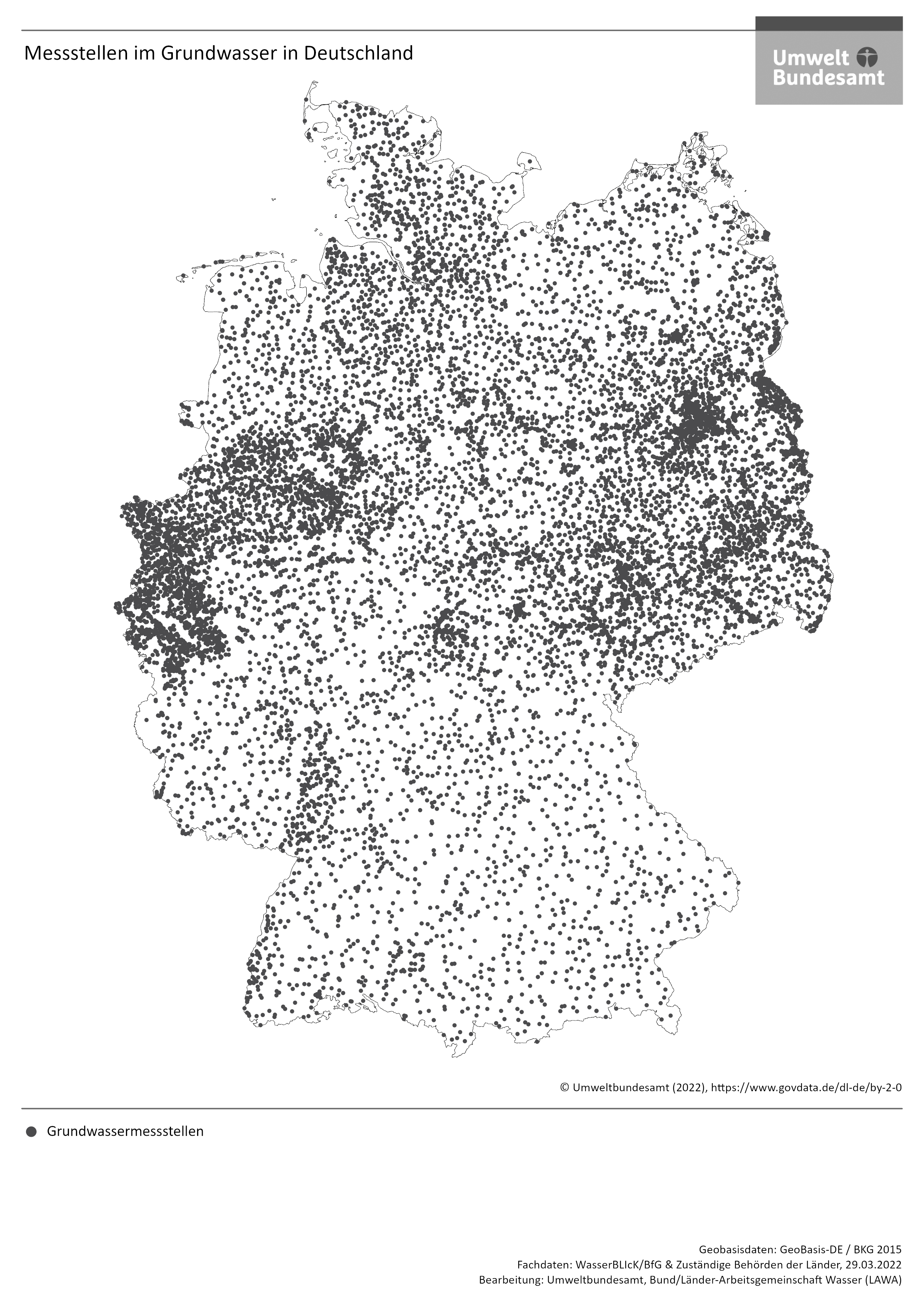 Die EU-⁠Wasserrahmenrichtlinie⁠ (WRRL 2000/60/EG) verpflichtet die Mitgliedstaaten, Messnetze zur Überwachung des chemischen und mengenmäßigen Zustands des Grundwassers einzurichten. Dafür betreiben in Deutschland die Bundesländer aktuell insgesamt 7715 Messstellen zur Überwachung des mengenmäßigen Zustands. Für die Überwachung des chemischen Zustandes werden 7869 Messstellen herangezogen. Diese werden unterschieden in Messstellen des operativen Messnetzes und Überblicksmessstellen. Die Überblicksmessstellen wurden vorwiegend in unbelasteten Grundwasserkörpern eingerichtet. Operative Messstellen sind in Grundwasserkörpern errichtet, die im schlechten chemischen Zustand sind. Mit allen diesen Messstellen werden in Deutschland aktuell insgesamt 1291 Grundwasserkörper mit einer durchschnittlichen Fläche von etwa 284 Quadratkilometern überwacht. Die Bewertungsergebnisse dieser Messstellen werden im 6-Jahres Turnus von den Bundesländern über die Bund/Länder Informations- und Kommunikationsplattform "WasserBLIcK" an die EU-Kommission berichtet. Das Umweltbundesamt wertet diese Berichte alle sechs Jahre für einen bundesdeutschen Gesamtüberblick aus.