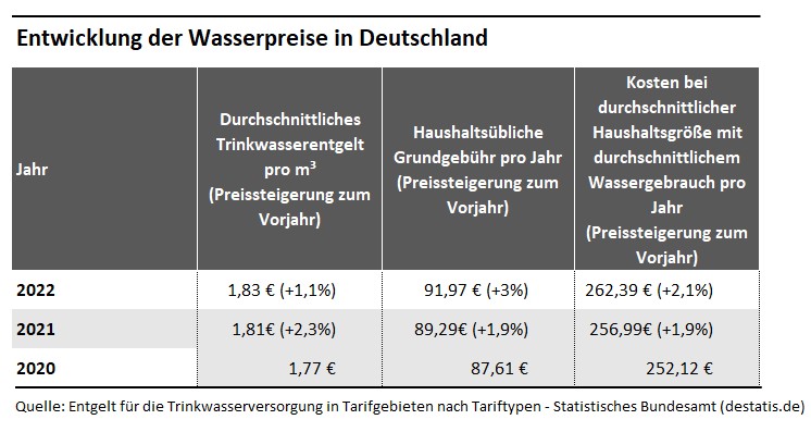 In einer Tabelle werden durchnschnittliches Trinkwasserentgelt, haushaltsübliche Grundgebühr und Kosten Wasserverbrauch der Jahre 2020 bis 2022 dargestellt. Entwicklung der Wasserpreise in Deutschland