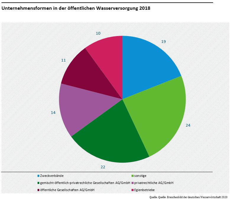 5.845 Betriebe und Unternehmen waren 2016 für die Wasserversorgung in Deutschland zuständig. 2018 waren davon 67 % öffentlich-rechtlich und 33 % privatrechtlich organisiert. Durch die privatrechtlichen Unternehmen wurden 57 % des Wasseraufkommens bereitgestellt (siehe Branchenbild der deutschen Wasserwirtschaft 2020).