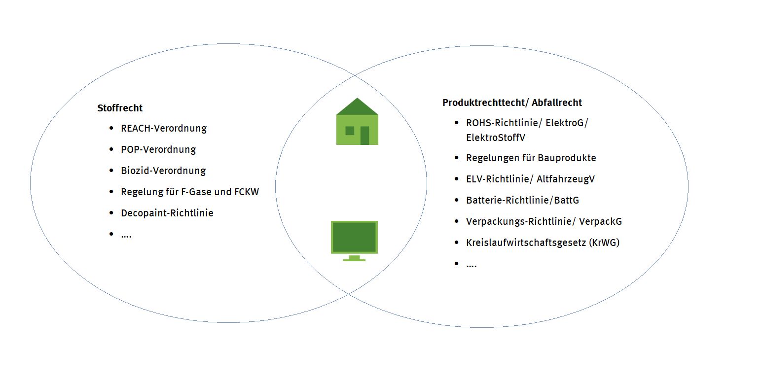 zwei Ovale greifen in einander, im einen stehen Rechtsgrundlagen des Stoffrechts, im anderen welche des Produkt- und Abfallrechts, in dem Feld, in dem sich beide Ovale überlappen, ist ein Piktogramm eines Hauses und eines Fernsehers zu sehen Für konkrete Produkte können mehrere Schadstoffregelungen aus unterschiedlichen Bereichen gelten.