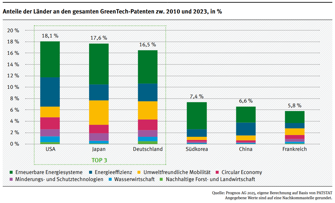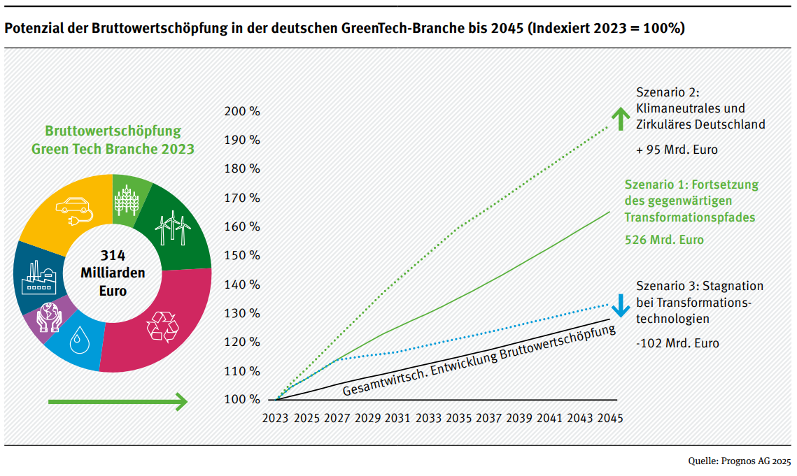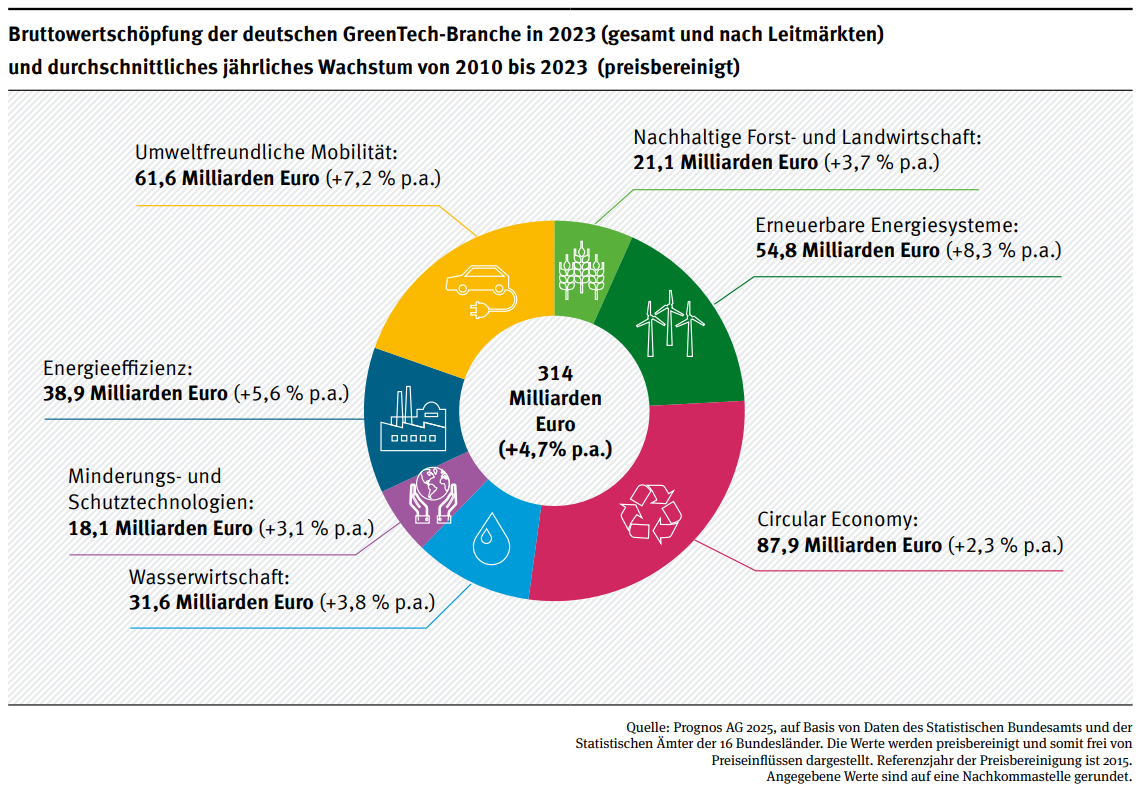 Die deutsche GreenTech-Branche wuchs zwischen 2010 und 2023 deutlich schneller als klassische Industriezweige, ist stark in den globalen Handel integriert und an vielen Stellen Innovationstreiber. Damit ist die GreenTech-Branche nicht nur für Klima und Umwelt wichtig, sondern auch ein essentieller Teil der deutschen Wirtschaft. Die deutsche GreenTech Branche trägt also zur Resilienz und Wettbewerbsfähigkeit des Wirtschaftsstandortes Deutschland bei.