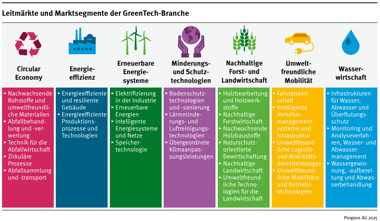 Die vorliegenden Ergebnisse des GreenTech Atlas 2025 wurden auf Basis amtlicher Statistiken und einer umfassenden Abgrenzung relevanter GreenTech-Güter und -Dienstleistungen berechnet. Der GreenTech Atlas wurde 2025 zum siebten Mal veröffentlicht. Er stellt wirtschaftliche Entwicklungen der Branche seit 2010 dar und zeigt Potenziale bis 2045 auf. Im GreenTech Atlas werden 7 Leitmärkte unterschieden, die sich wiederum in unterschiedliche Marktsegmente unterteilen.