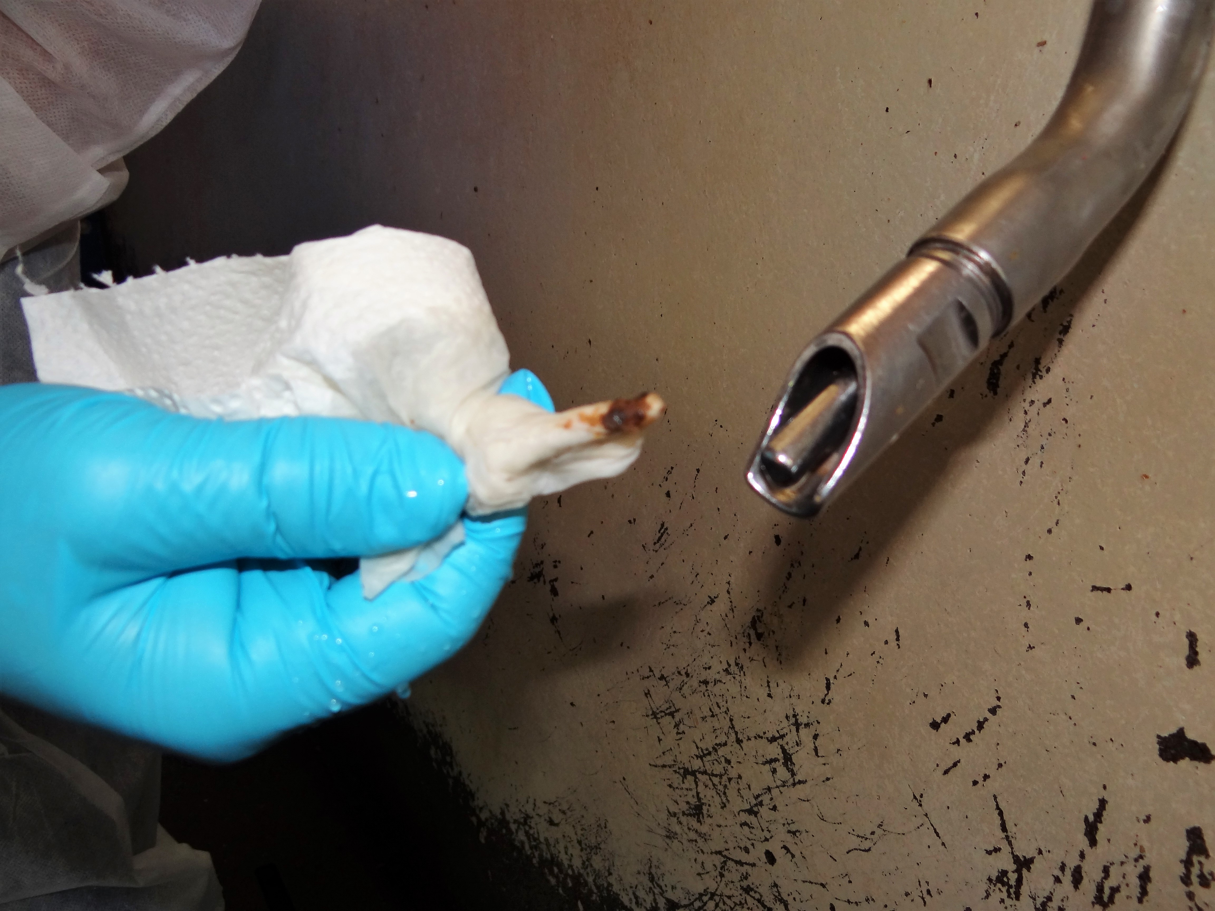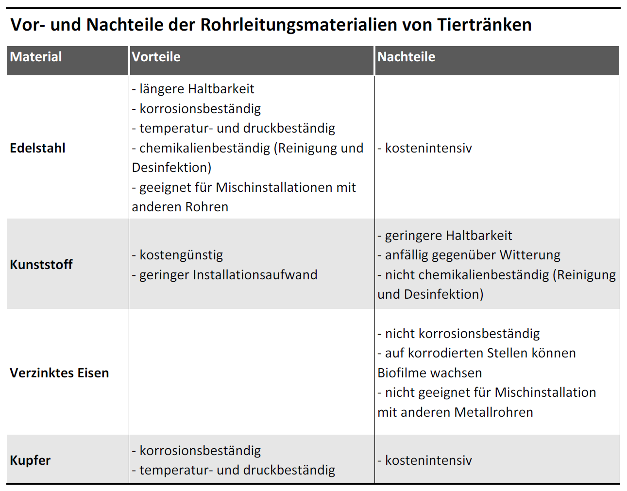 Material und Art des Leitungssystems einer Tränkeeinrichtung beeinflussen die Biofilmbildung. Neigt das Material der Leitungen zu Korrosionsschäden oder Schadstoffeinträgen, sind diese für den Einsatz im Stall nicht geeignet. Korrosionen bieten ideale Bedingungen für das Anheften eines Biofilms(63). Schadstoffeinträge können entstehen, wenn das Material Temperaturen, Druck oder chemischen Stoffen im Zuge der Reinigung und Desinfektion ausgesetzt wird. Problematisch sind vor allem kostengünstige Leitungen aus verzinktem Eisen oder Kunststoff. Gibt es Hinweise für eine starke Biofilmbildung in den Leitungen, kann durch stichprobenartiges Aufschneiden der Leitungen und Betrachtung des Rohrquerschnitts die Situation genauer beurteilt werden. In kritischen Fällen hilft nur der Austausch des Leitungssystems.