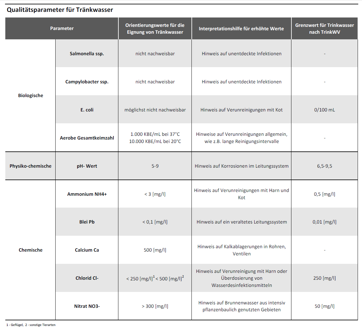 Wichtig sind tägliche Funktionskontrollen und die Sicherstellung des Zugangs für alle Tiere zu Tränkwasser durch eine ausreichende Anzahl von Tränken. Tränkwasser unterliegt den Anforderungen der Futtermittelhygiene-Verordnung VO (EG) Nr. 183/2005). Tränkwasser sollte so beschaffen sein, dass es für die betreffenden Tiere geeignet ist. Dazu gibt das Bundesministerium für Ernährung und Landwirtschaft (BMEL) Orientierungswerte vor(62). Neben Schmackhaftigkeit und Verträglichkeit gehören dazu auch Orientierungswerte für biologische und chemische Qualitätskriterien.