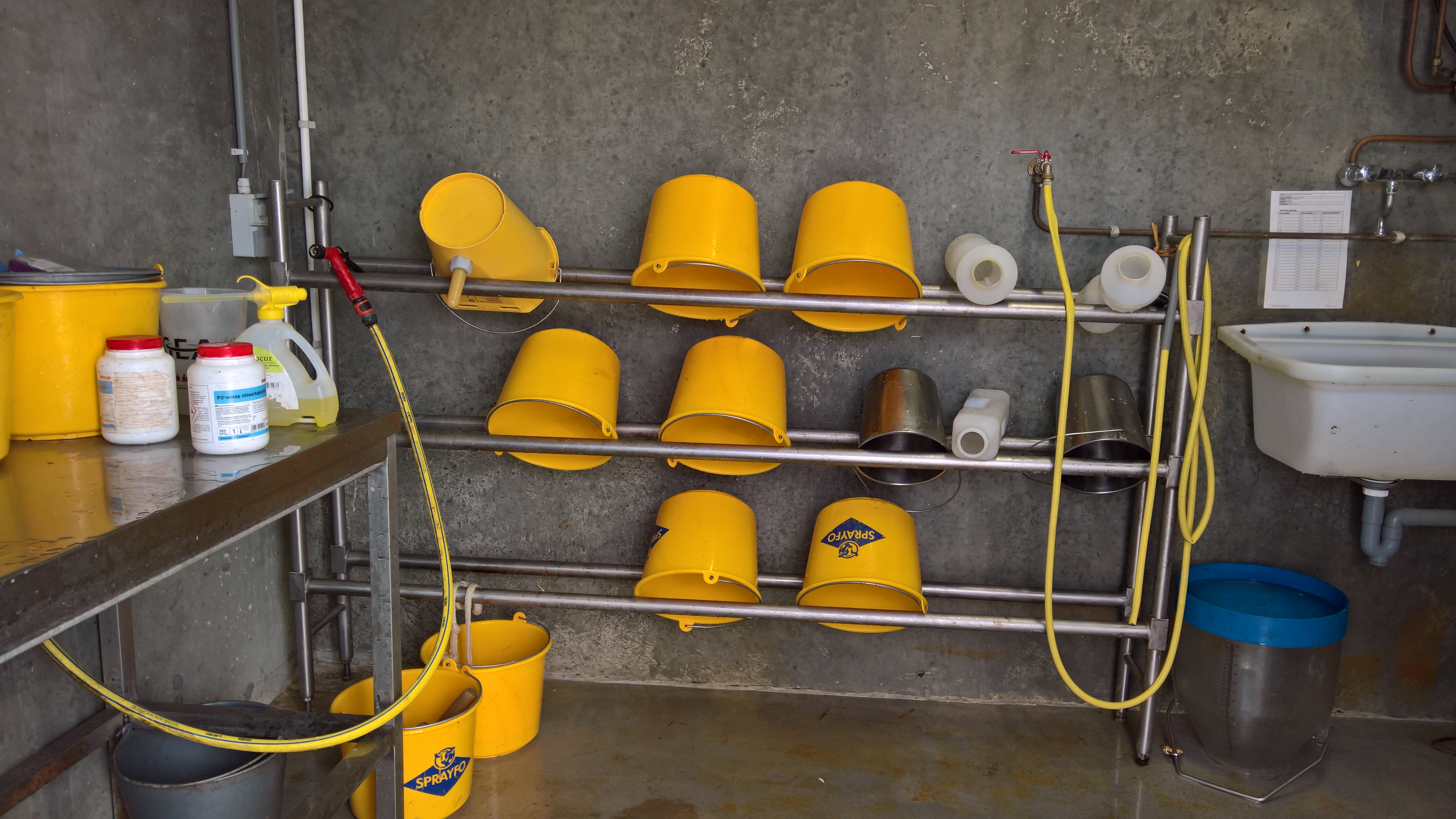 Leitungen und Tränkeeinrichtungen müssen regelmäßig gereinigt werden. Für die Desinfektion der Rohrleitungen eignet sich der Einsatz von Chlordioxid, Peressigsäure und Propionsäure. In der Geflügelwirtschaft ist dies bereits gängige Praxis. Eine Spülung der Leitung nach der Anwendung von Desinfektionsmitteln stellt nicht nur sicher, dass die Chemikalien nicht von den Tieren aufgenommen werden, sondern auch, dass eventuell freigewordene Gifte (z. B. Endotoxine) entfernt werden. Umweltschonender sind mechanische Verfahren zur Reinigung der Leitungen, wie die Anwendung von Kugeln, Rohrreinigungsspiralen oder Druck. Diese werden von Unternehmen durchgeführt und sind dadurch kostenintensiver, helfen aber im Speziellen, wenn die Keim- und Endotoxinbelastung des Tränkwassers als wahrscheinliche Ursache für Gesundheitsprobleme identifiziert wurde. Untersuchungen in zur Einstallung vorbereiteten Schweinebuchten zeigten, dass Tränken und Tröge die größte Schwachstelle für Verschleppungen von Keimen selbst in konsequenten Rein-Raus-Systemen darstellen(64). Dabei gestaltet sich bei Nippeltränken speziell die Reinigung der Endstücke als schwierig. Wesentliche Verbesserungen der Tiergesundheit können auch bei einer gründlichen Reinigung von Nippeleimern in der Kälberaufzucht erwartet werden (siehe Abbildung). Nach der Reinigung empfiehlt sich die Trocknung und Lagerung der Nippeleimer in Regalen.