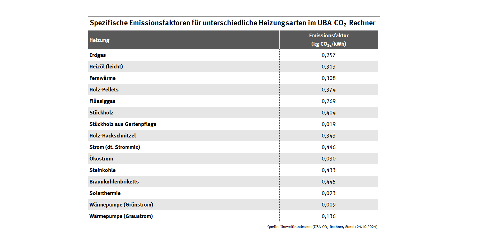 Beim CO2-Rechner werden grundsätzlich sowohl die direkten Emissionen von Brennstoffen als auch die indirekten Emissionen aus der Vorkette (Herstellung, Transport) betrachtet. Zudem werden neben CO2 auch weitere Treibhausgase wie Methan und Lachgas berücksichtigt. Die einzelnen Emissionsfaktoren lassen sich direkt im UBA-CO2-Rechner durch die Eingabe der Verbräuche herauslesen. Normiert auf die Einheit kWh ergeben sich die in der Tabelle aufgeführten Werte für die unterschiedlichen Brennstoffe.